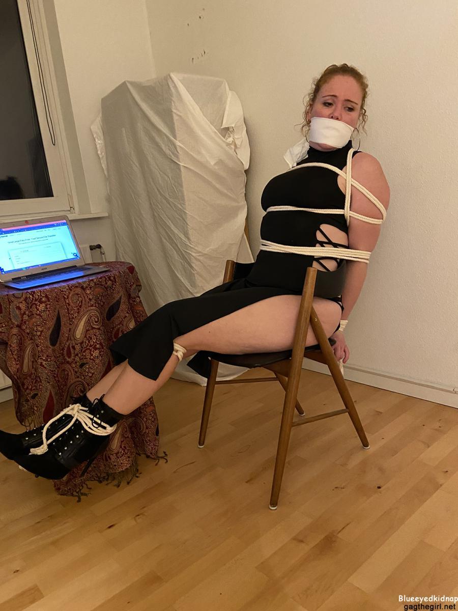 Redheaded May is Danish girl tied up and over-the-mouth gagged in a beautiful dress and high heels! From Clips4sale Blueeyedbondage studio.