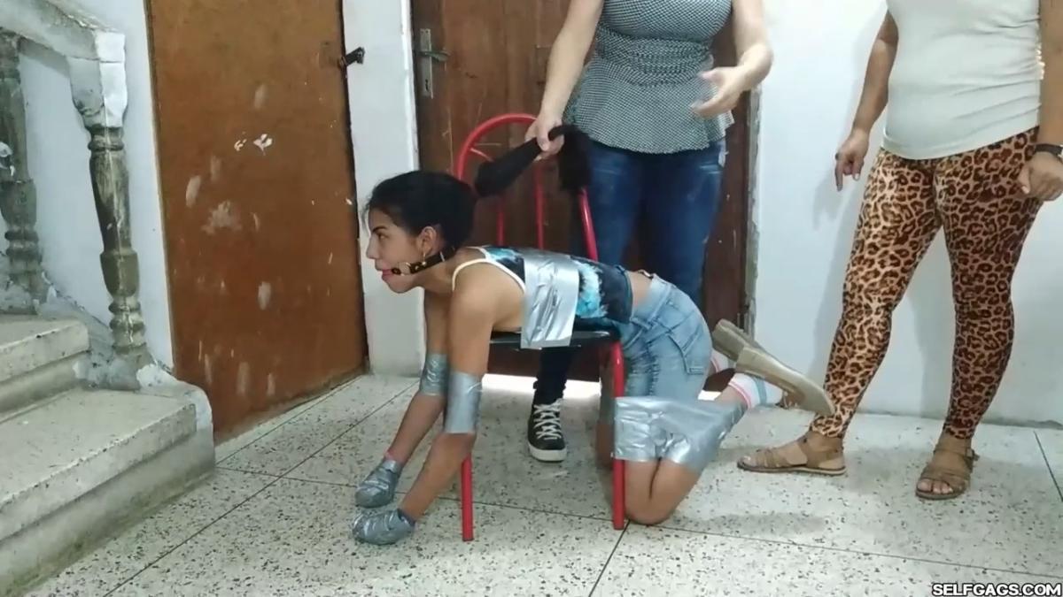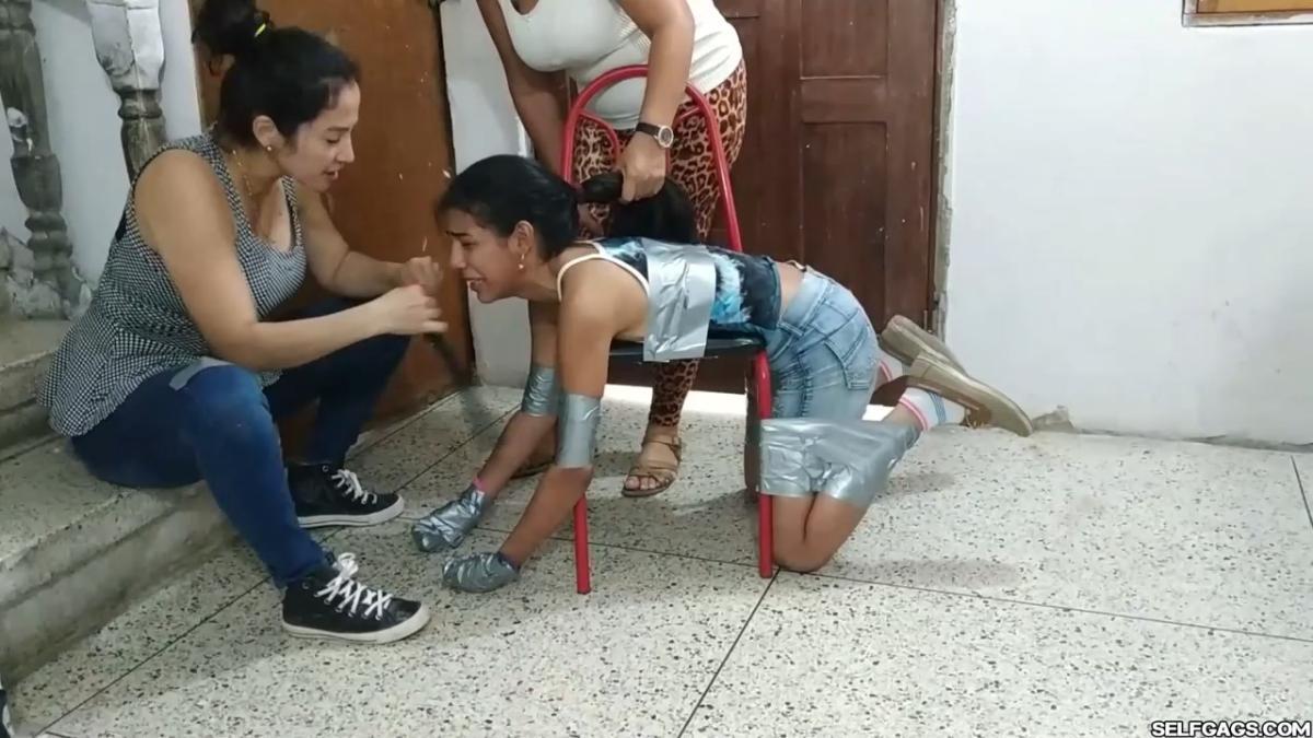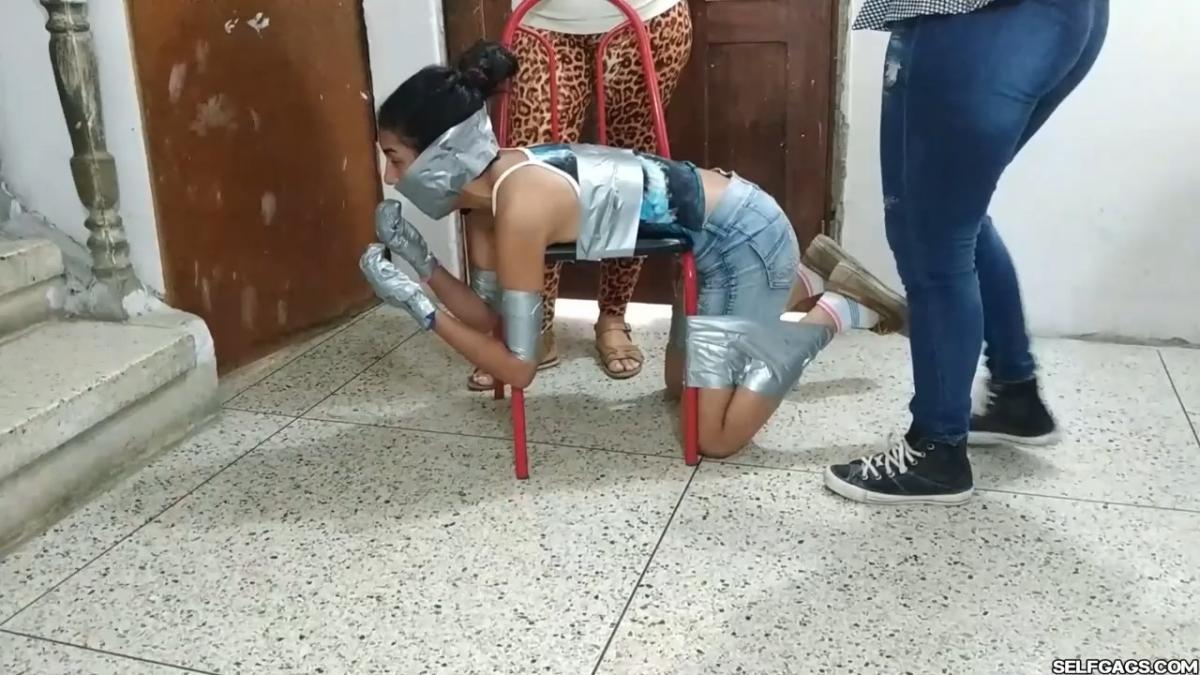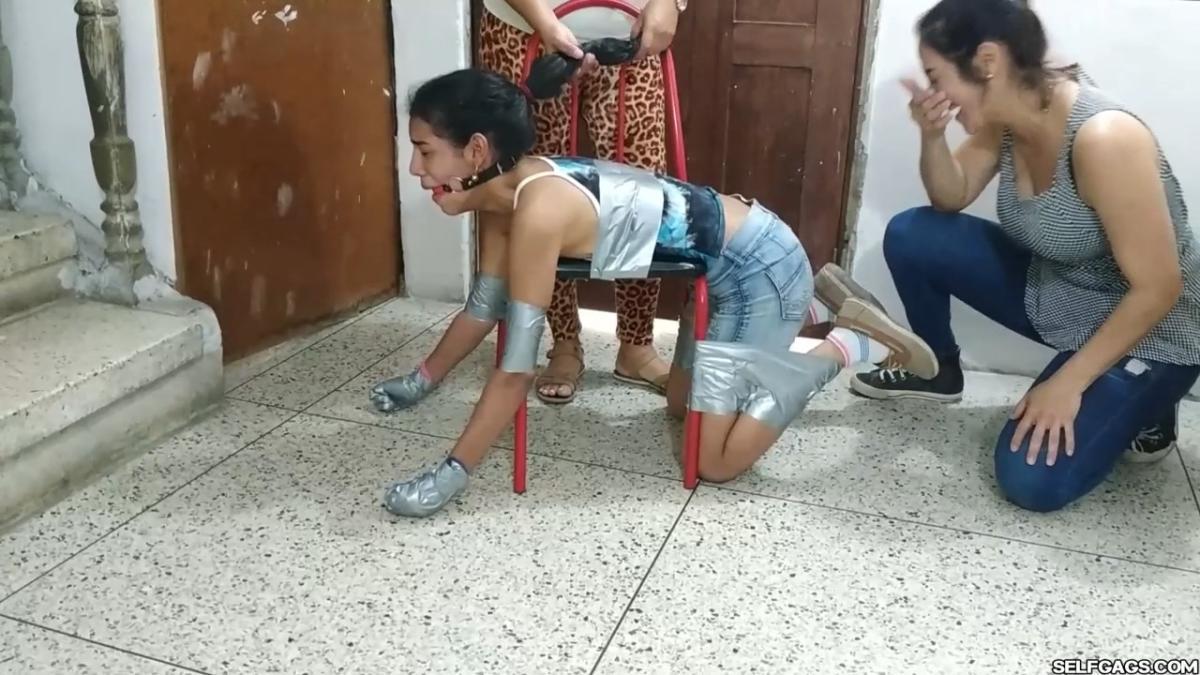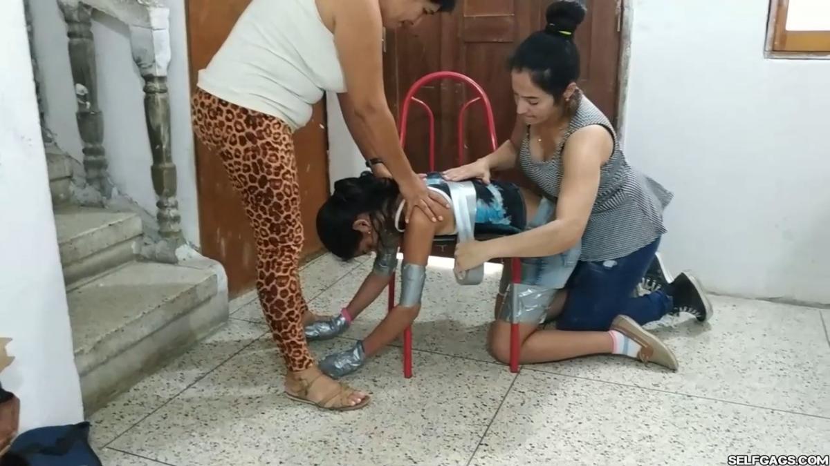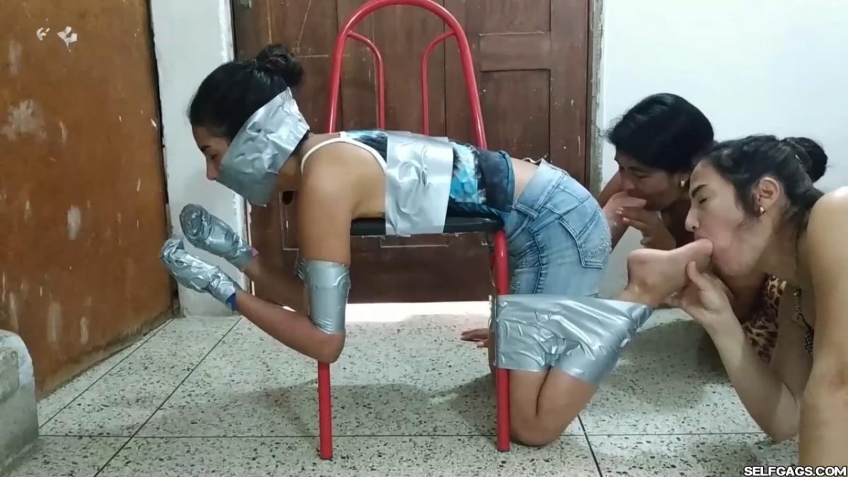 A duct tape gagged girl (Maria Martinez) held prisoner by two MILFs (Laura Martinez & Wendy Lopez) is led into the basement. Here, the two women encase the girl’s hands in socks and wrap duct tape around them. The girl’s tape gag is removed and replaced by a kinky red ball gag. She is then bent over a chair and effectively duct-taped to it in a very strict way so that she is immobilized and completely clung to it! A strong odeur from the girl’s soft feet spreads in the room, making the two women cough and wave their hands in front of their noses. Her smelly feet need to be cleaned and the women are gonna use their mouths to do so! From SELFGAGS Clips4sale studio.