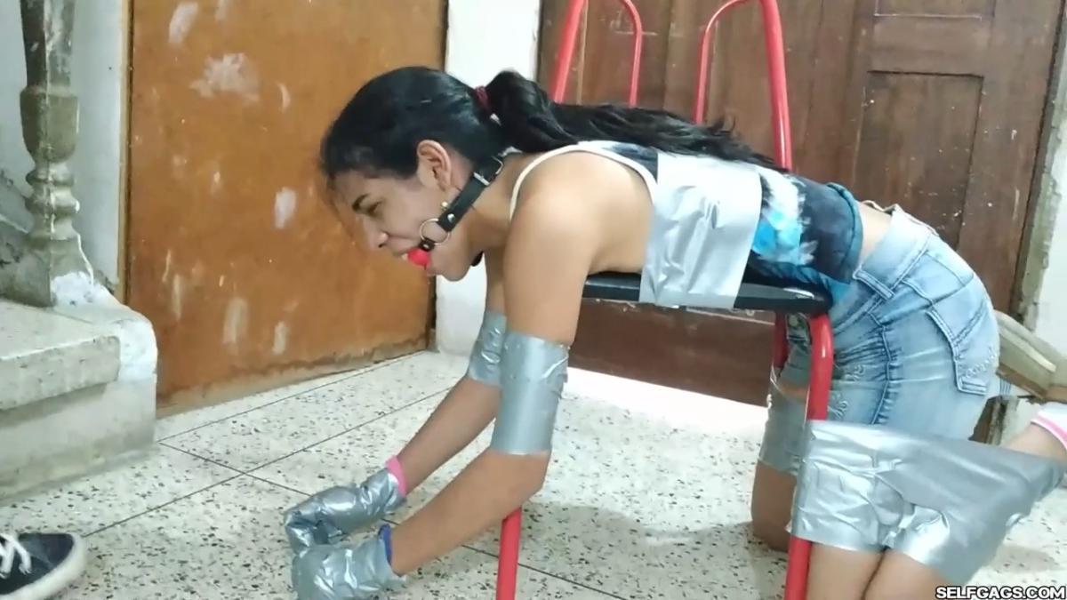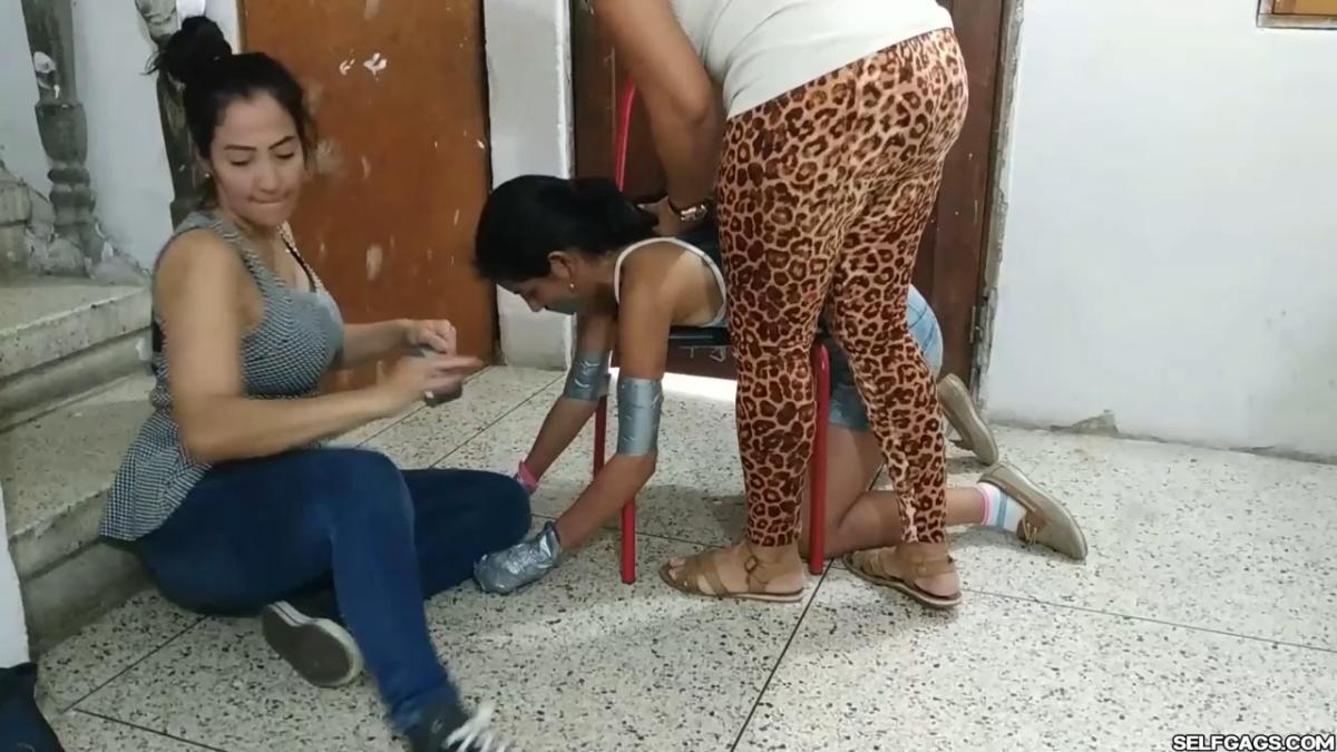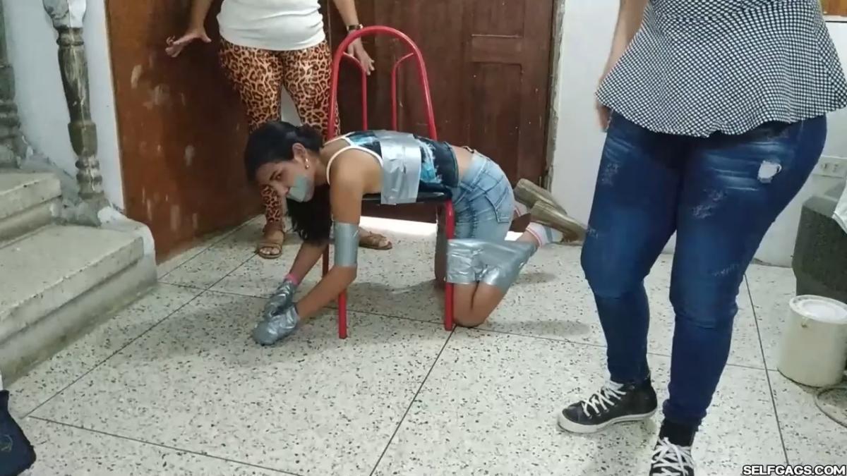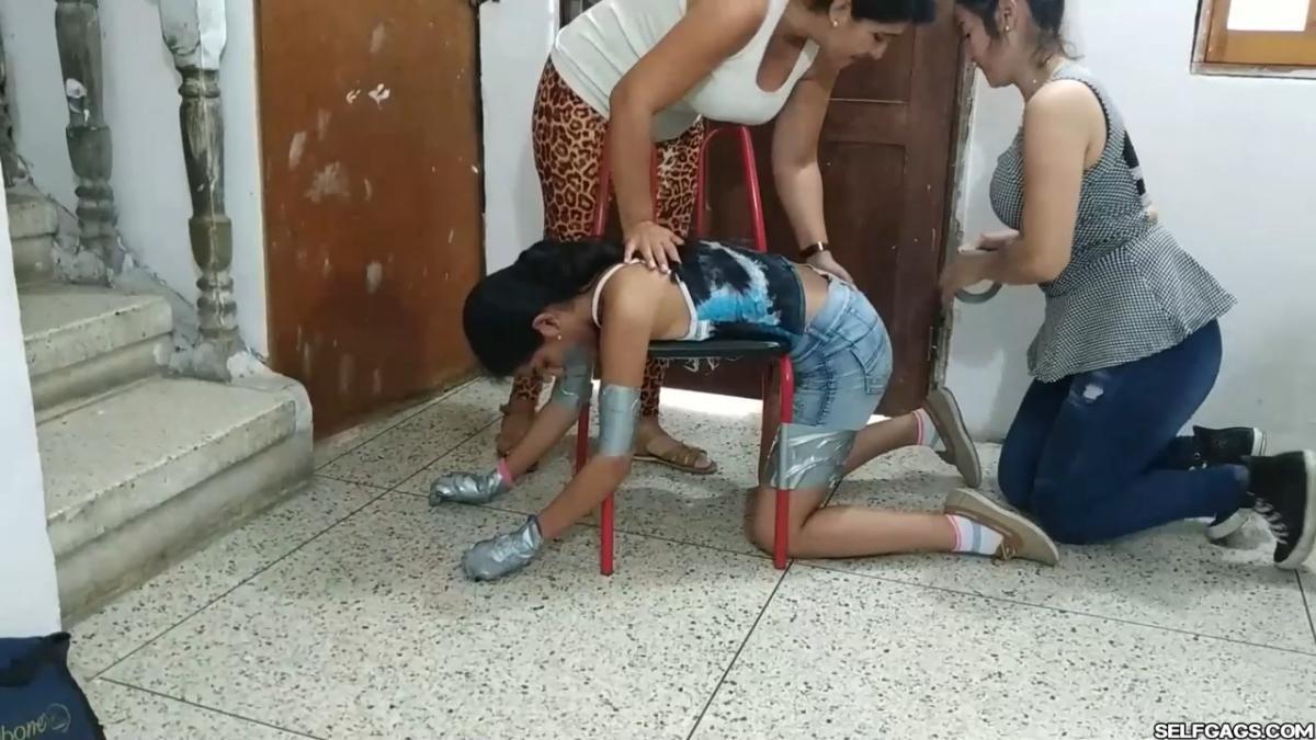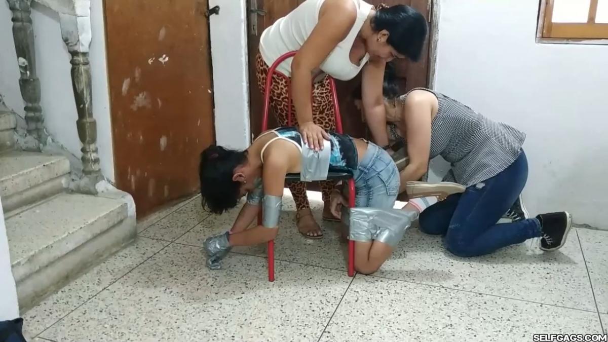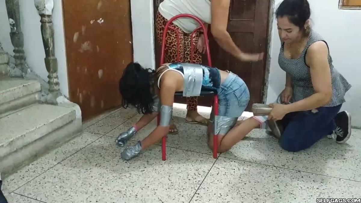 A duct tape gagged girl (Maria Martinez) held prisoner by two MILFs (Laura Martinez & Wendy Lopez) is led into the basement. Here, the two women encase the girl’s hands in socks and wrap duct tape around them. The girl’s tape gag is removed and replaced by a kinky red ball gag. She is then bent over a chair and effectively duct-taped to it in a very strict way so that she is immobilized and completely clung to it! A strong odeur from the girl’s soft feet spreads in the room, making the two women cough and wave their hands in front of their noses. Her smelly feet need to be cleaned and the women are gonna use their mouths to do so! From SELFGAGS Clips4sale studio.