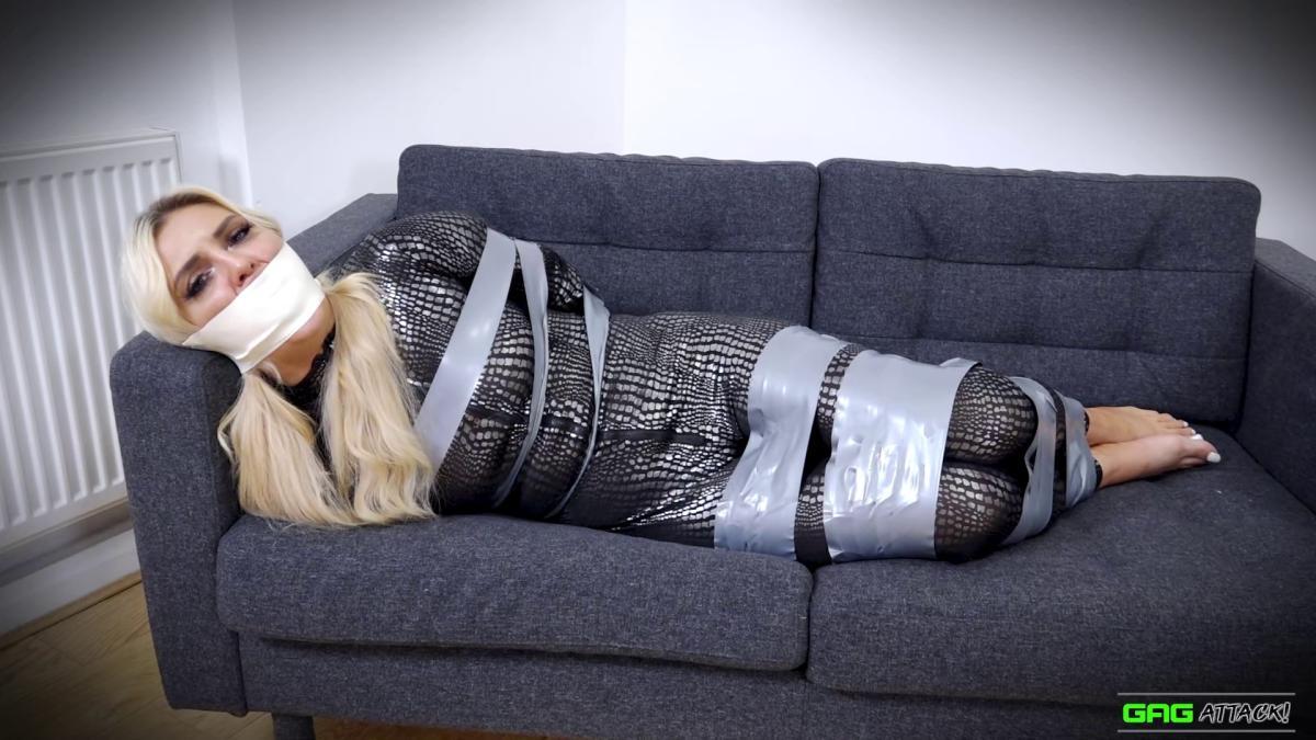 Look at Roxee: A sexy blonde all tied up in a catsuit and barefoot in tape bondage! Of course, the beautiful girl doesn’t know how to keep her mouth shut so she is gagged with PVC tape and microfoam tape wrapped around the head, a panty gag with a clear tape gag, and an OTM/OTN gag! From Gag Attack Bondage at Clips4sale.