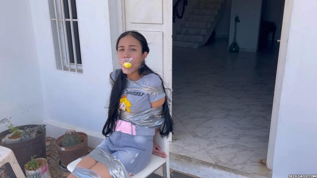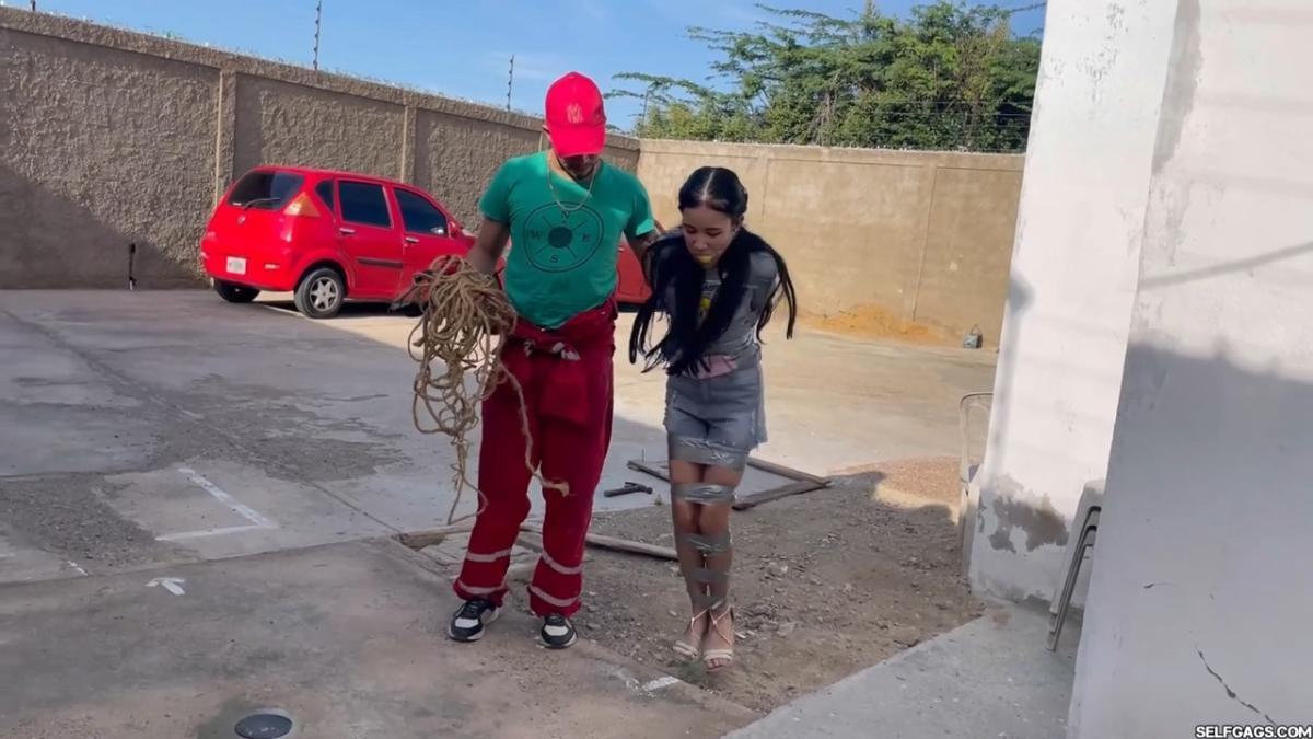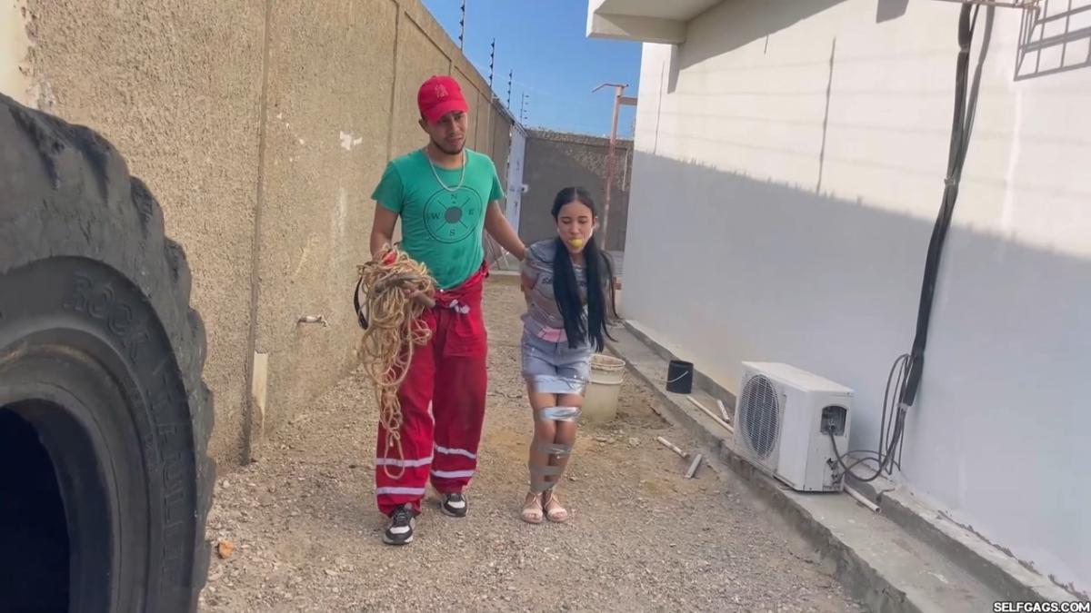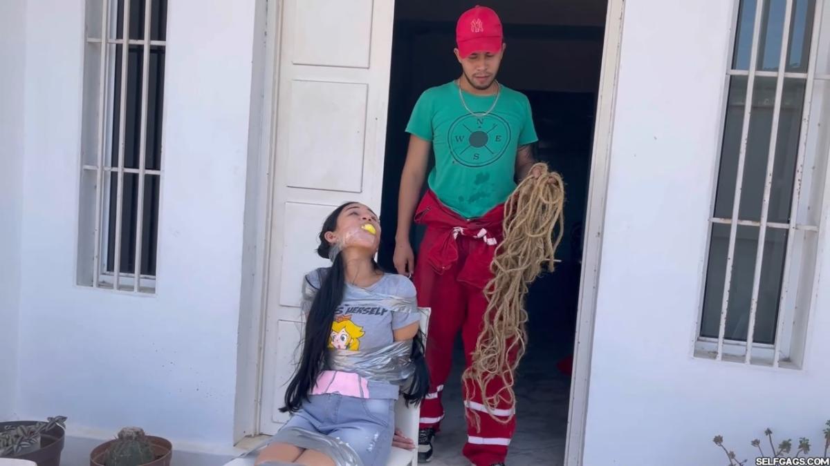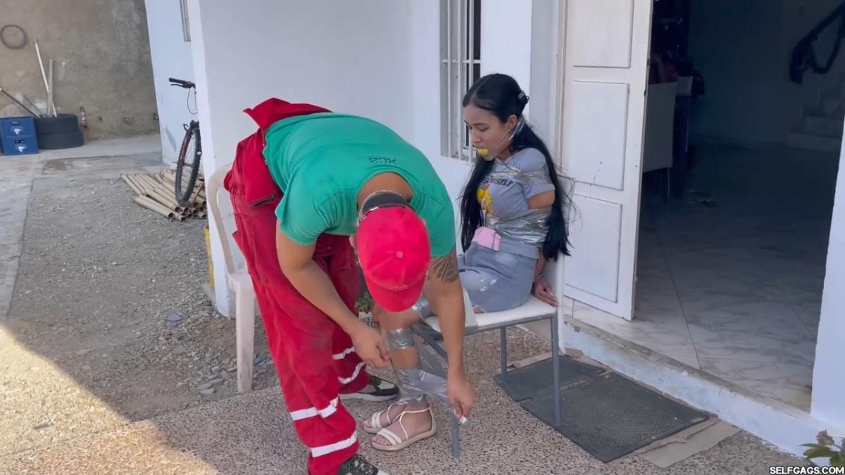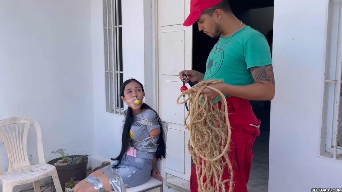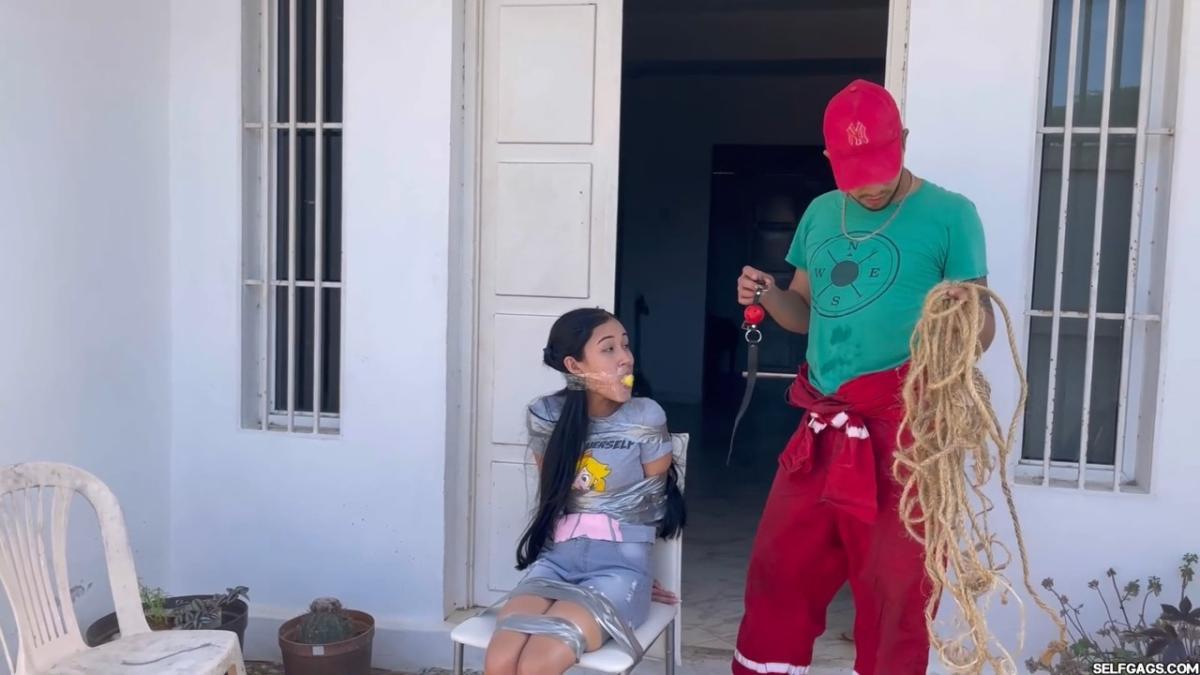 After a short break, the sexy handyman returns to check on his restrained guest, Barby Luna, still taped to the chair outside. This time, he brings new gear—some rope and a ballgag he found tucked away in the bedroom. He unties Barby from the chair, but keeps her bound and gagged, making her hop across the yard, struggling adorably in her taped sandals. From Clips4sale Selfgags studio.