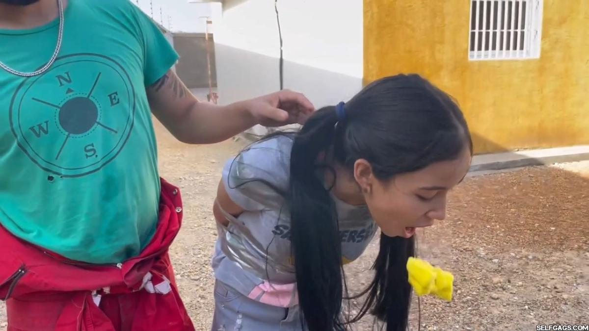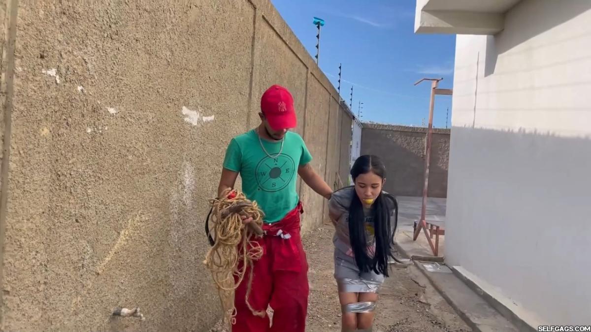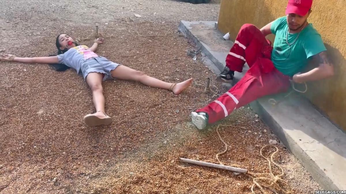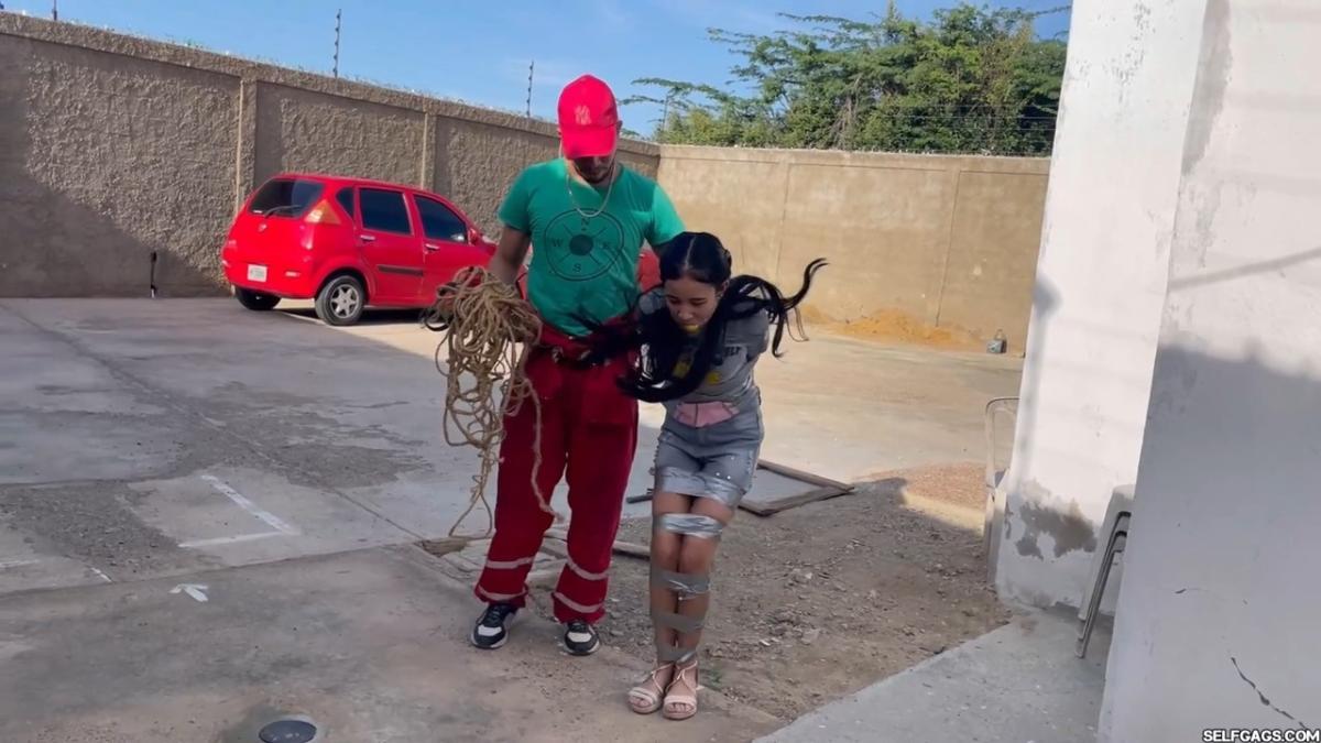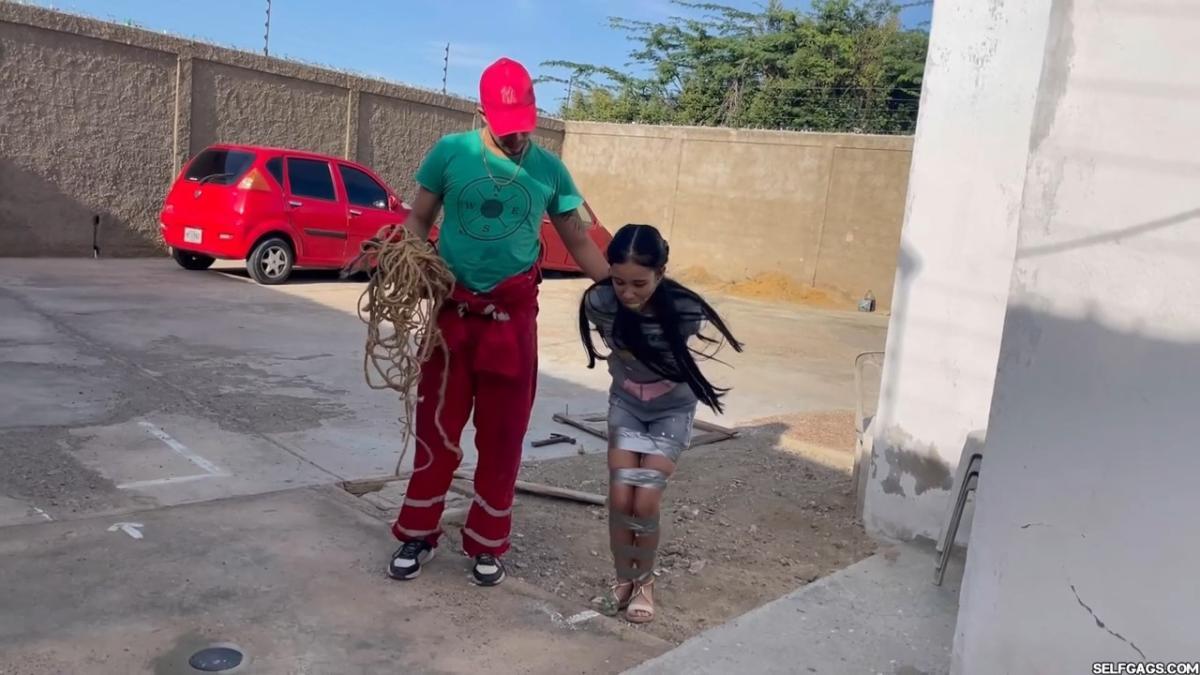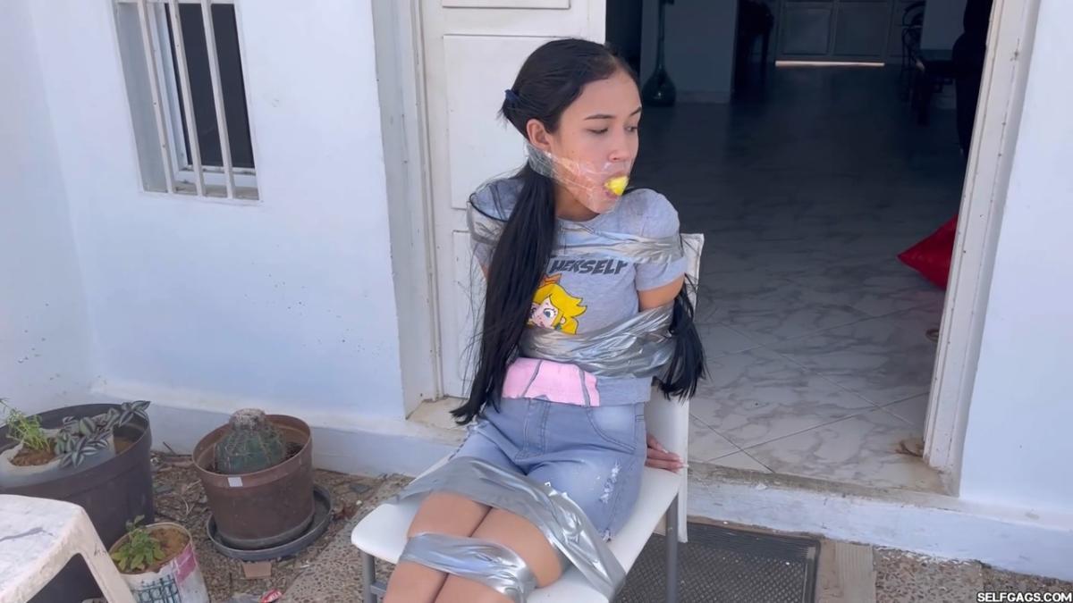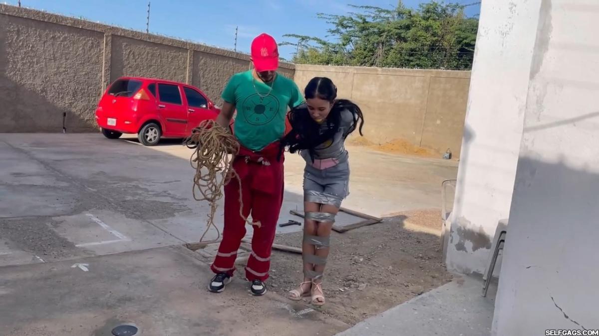 After a short break, the sexy handyman returns to check on his restrained guest, Barby Luna, still taped to the chair outside. This time, he brings new gear—some rope and a ballgag he found tucked away in the bedroom. He unties Barby from the chair, but keeps her bound and gagged, making her hop across the yard, struggling adorably in her taped sandals. From Clips4sale Selfgags studio.