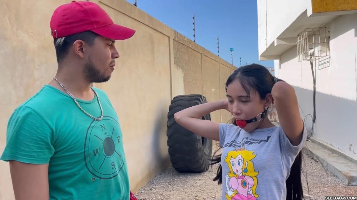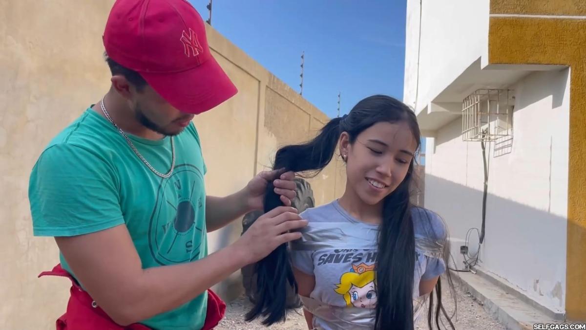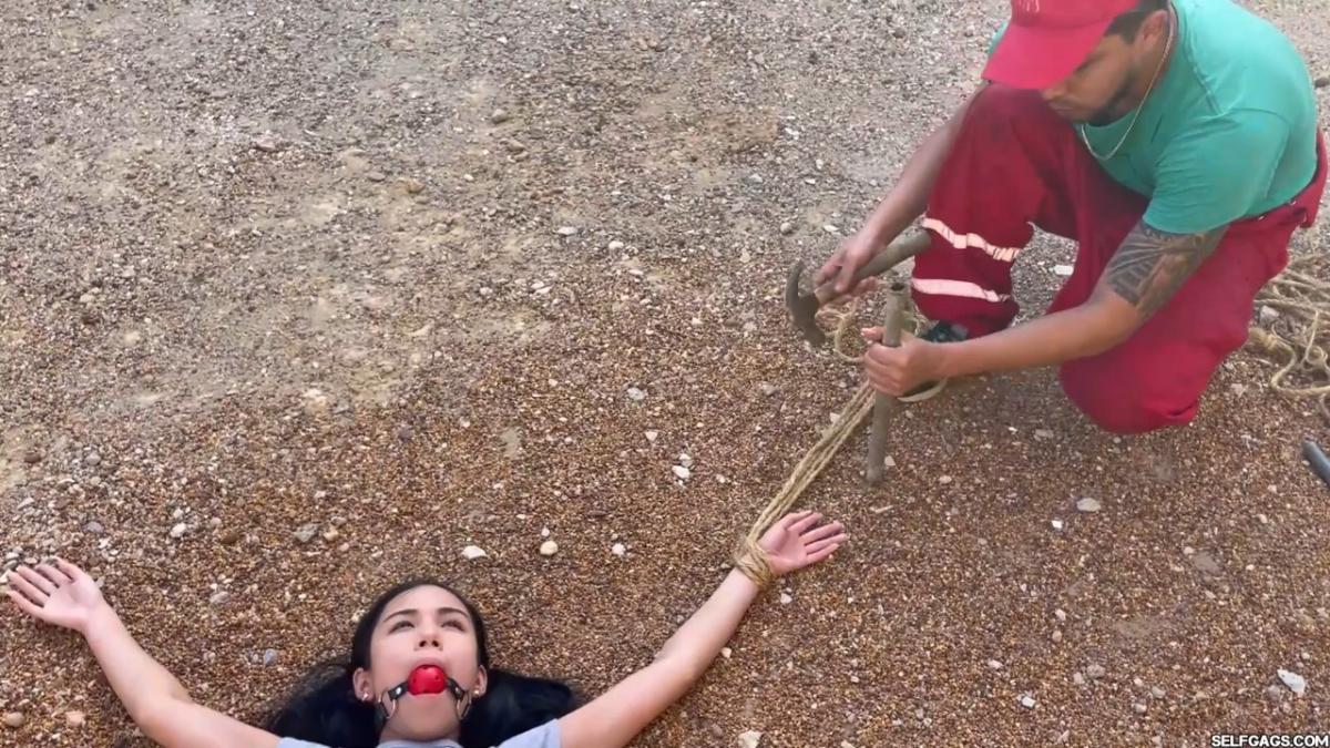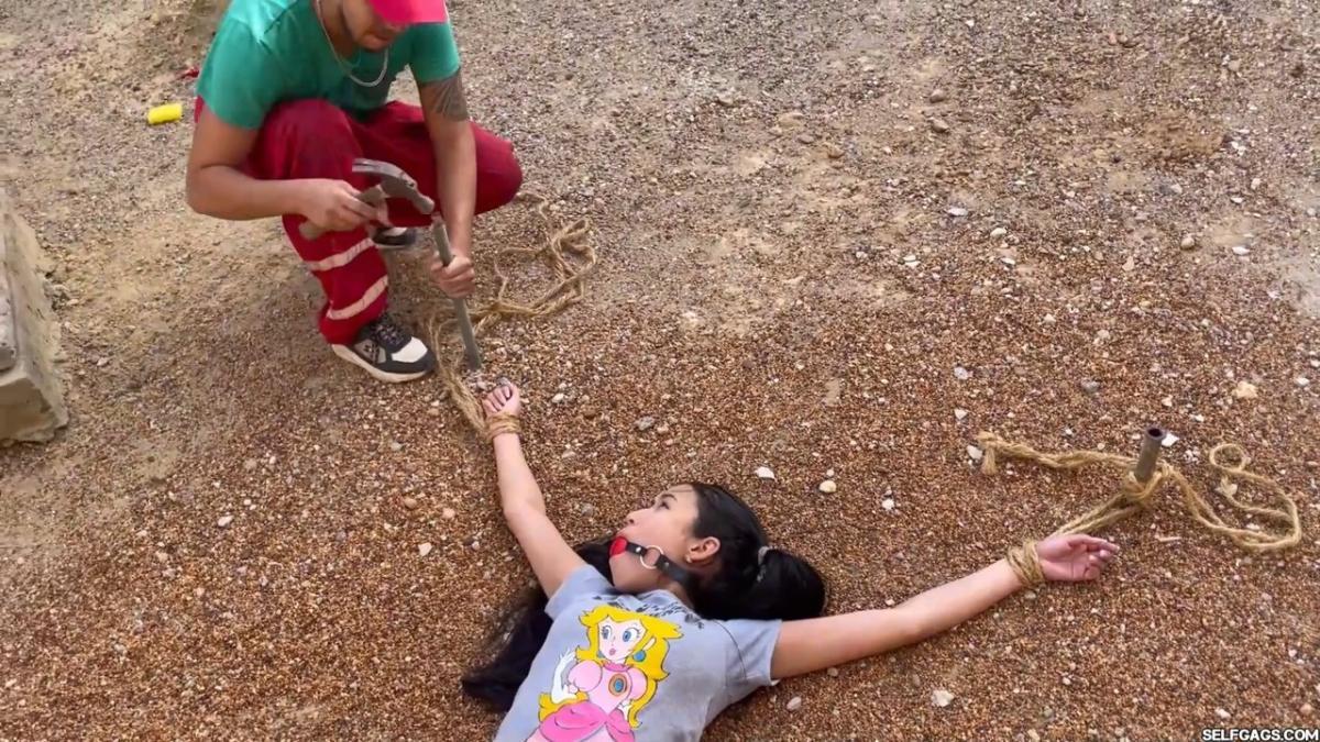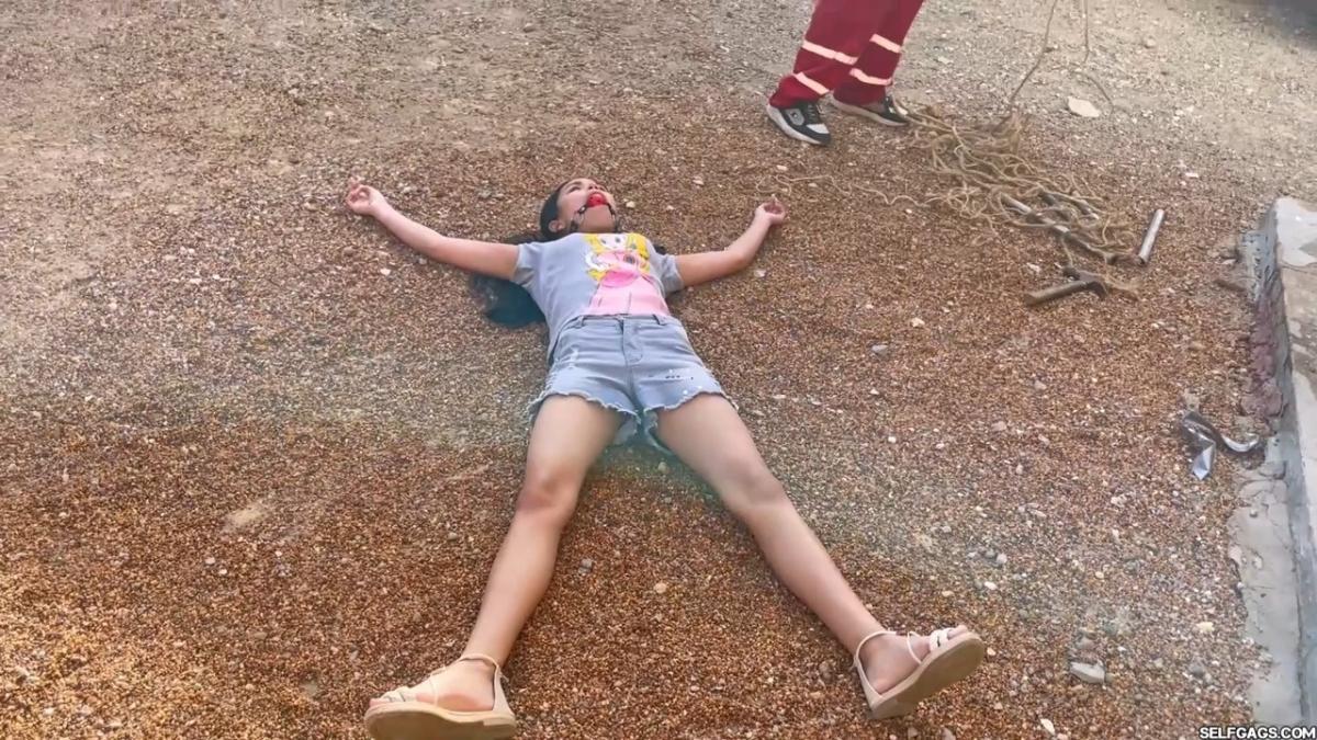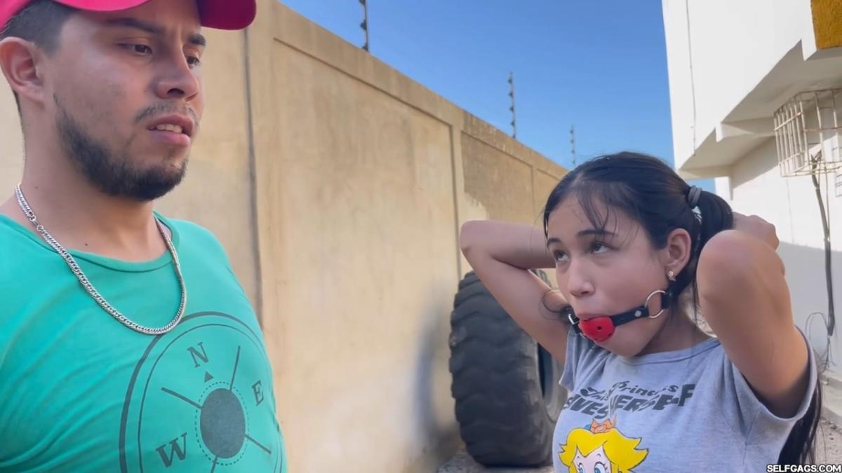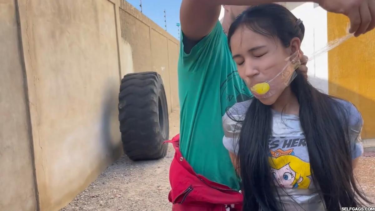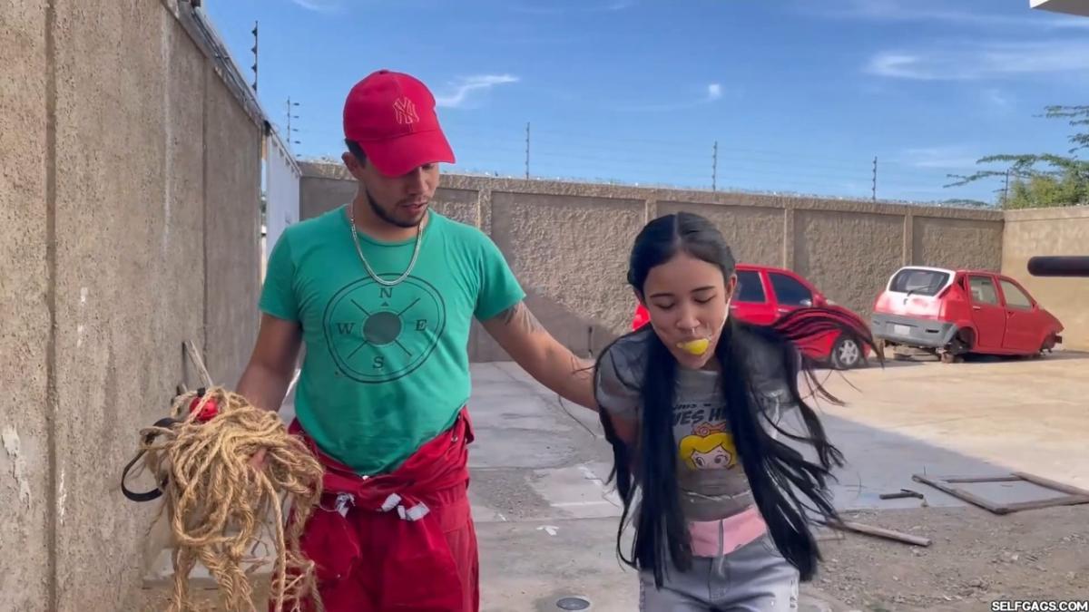 After a short break, the sexy handyman returns to check on his restrained guest, Barby Luna, still taped to the chair outside. This time, he brings new gear—some rope and a ballgag he found tucked away in the bedroom. He unties Barby from the chair, but keeps her bound and gagged, making her hop across the yard, struggling adorably in her taped sandals. From Clips4sale Selfgags studio.