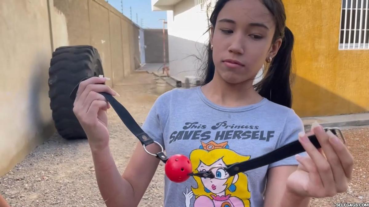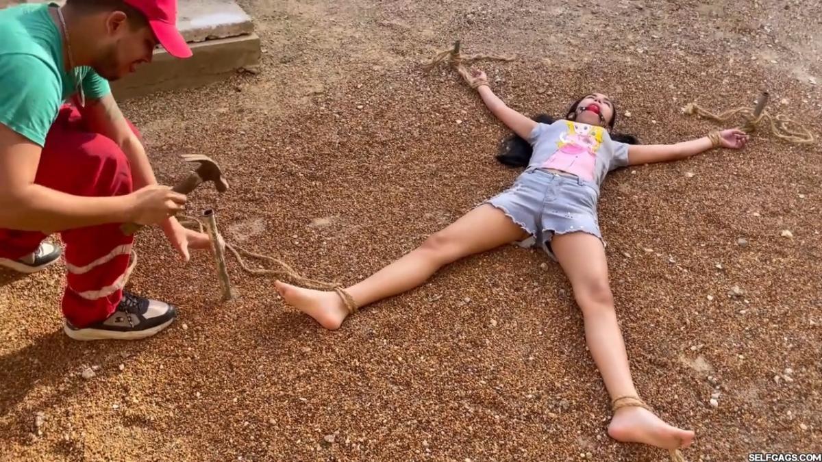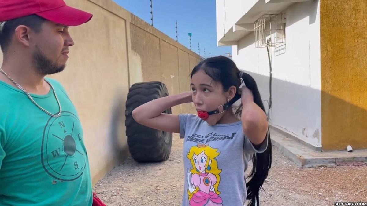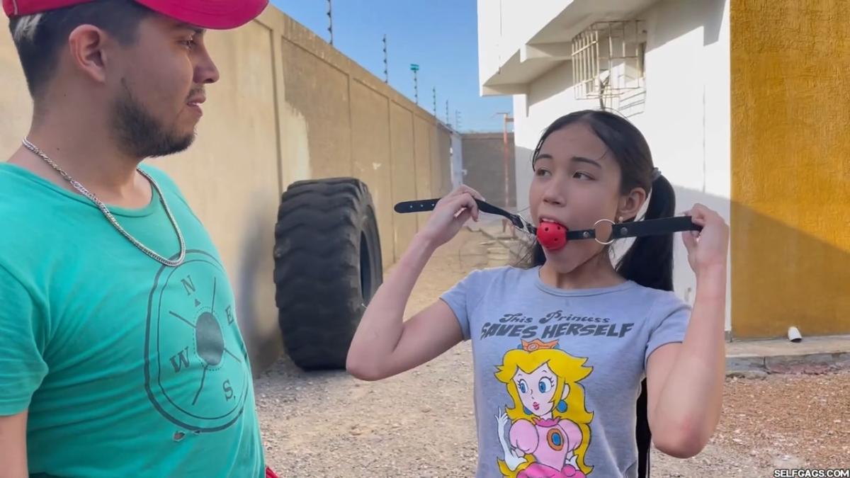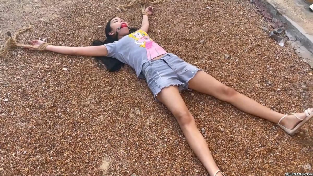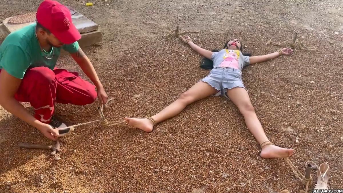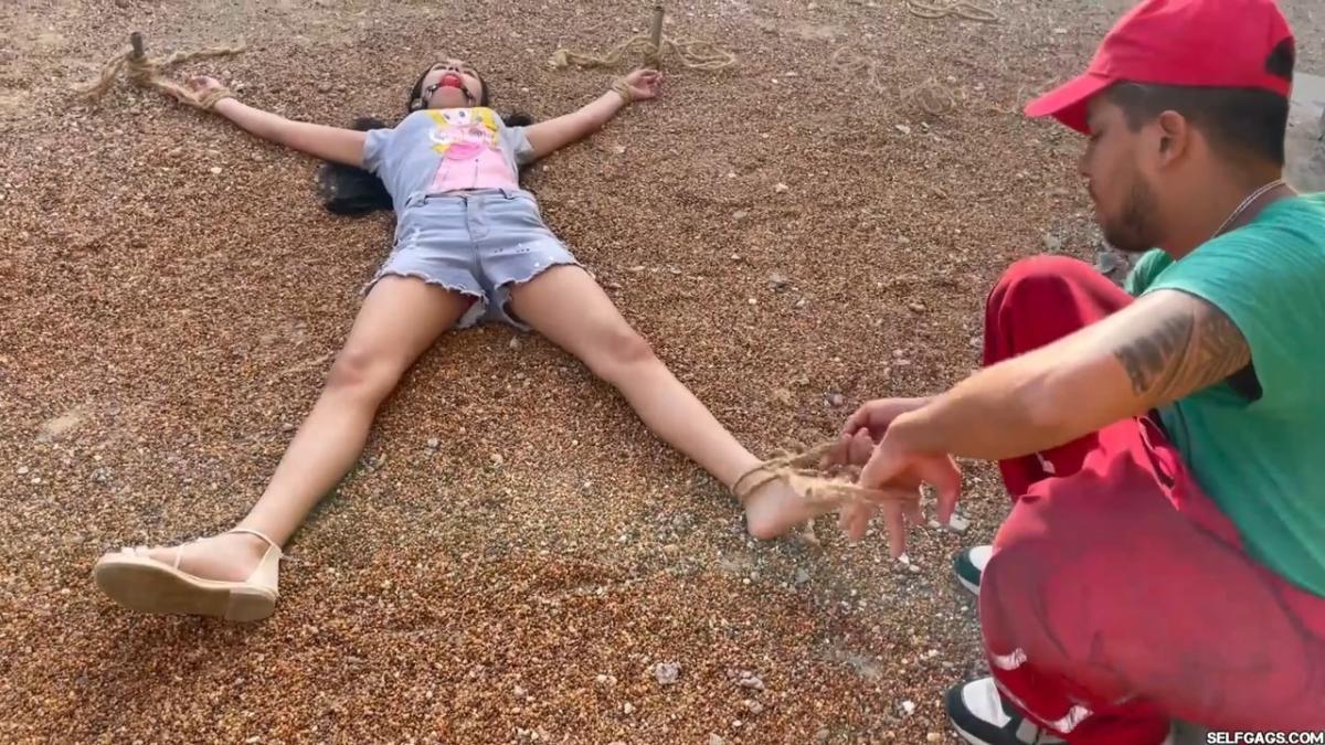 After a short break, the sexy handyman returns to check on his restrained guest, Barby Luna, still taped to the chair outside. This time, he brings new gear—some rope and a ballgag he found tucked away in the bedroom. He unties Barby from the chair, but keeps her bound and gagged, making her hop across the yard, struggling adorably in her taped sandals. From Clips4sale Selfgags studio.