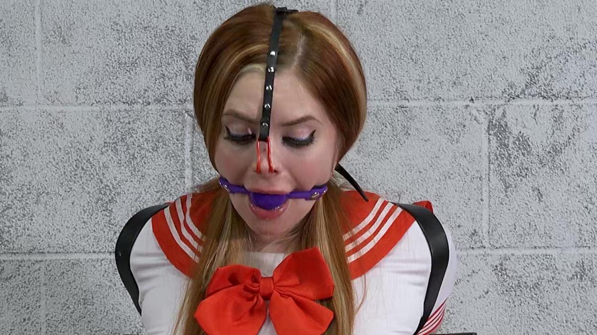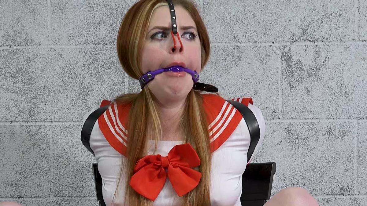 Dresden is all dressed up in her adorable school uniform, tied with her legs spread and cute white cotton panties exposed. For added humiliation, her nose is pulled into a cute piggy snout with a red nose hook and her mouth is fully and tightly gagged with a purple ball gag. She squirms and struggles, unable to free herself from her tight armbinder and strict rope bondage. From GAGGED GIRLS Studio on Clips4sale.