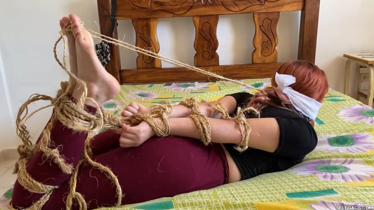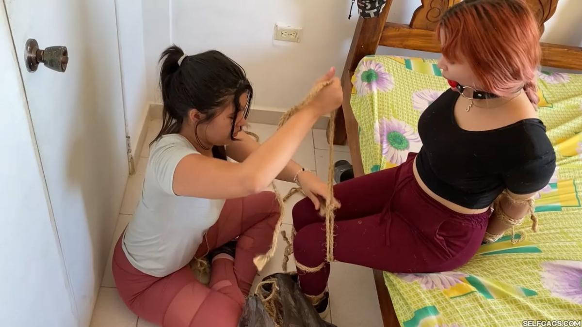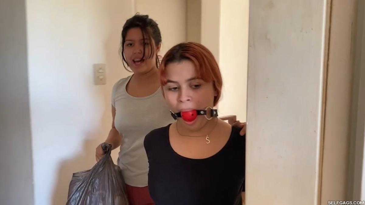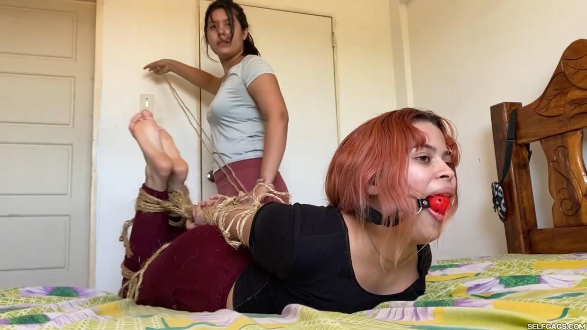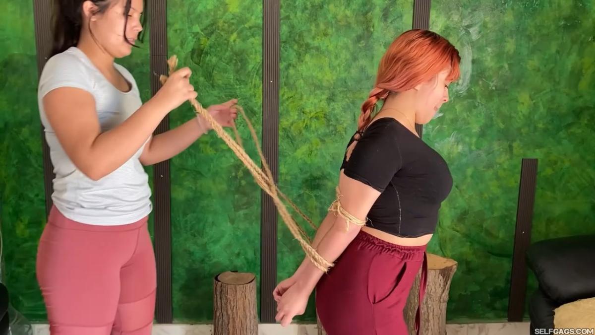 Xandra has never been tied up with rope before and she has heard Mary Macaya is good at it. Xandra wants to try to rope bondage and Mary is happy to help. Mary ties Xandra’s hands behind her back and her elbows together, puts a red ball gag in Xandra’s mouth and locks it tight. Mary leads the rope bound and gagged girl up the stairs and into a bedroom where she proceeds with tying her up! From SELFGAGS studio on Clips4sale.