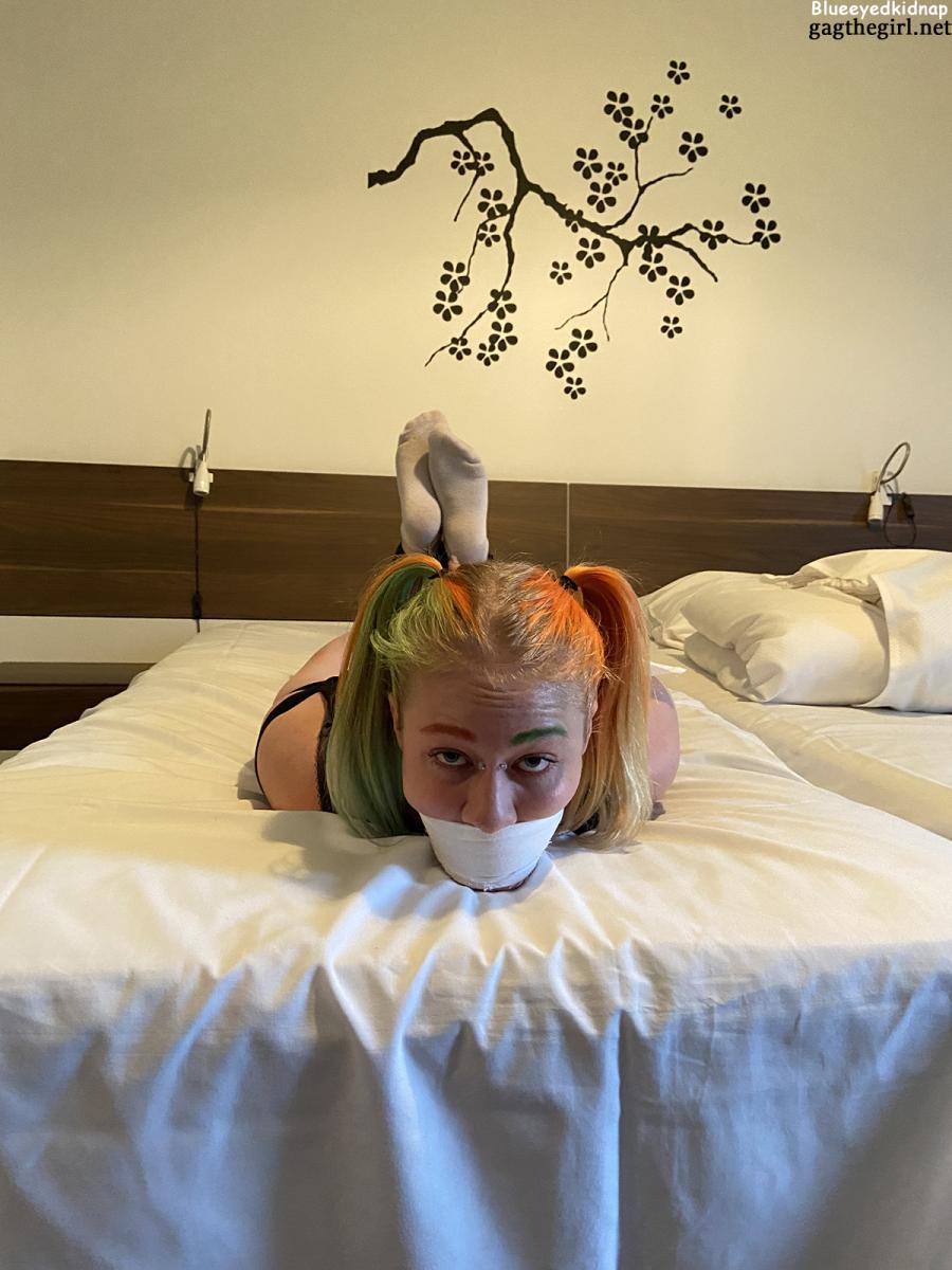 Gia is a Harley Quinn wanna-be all stuck and helpless in rope bondage. Her big mouth is kept shut with an OTM gag, just like she deserves! From Blueeyedbondage studio.