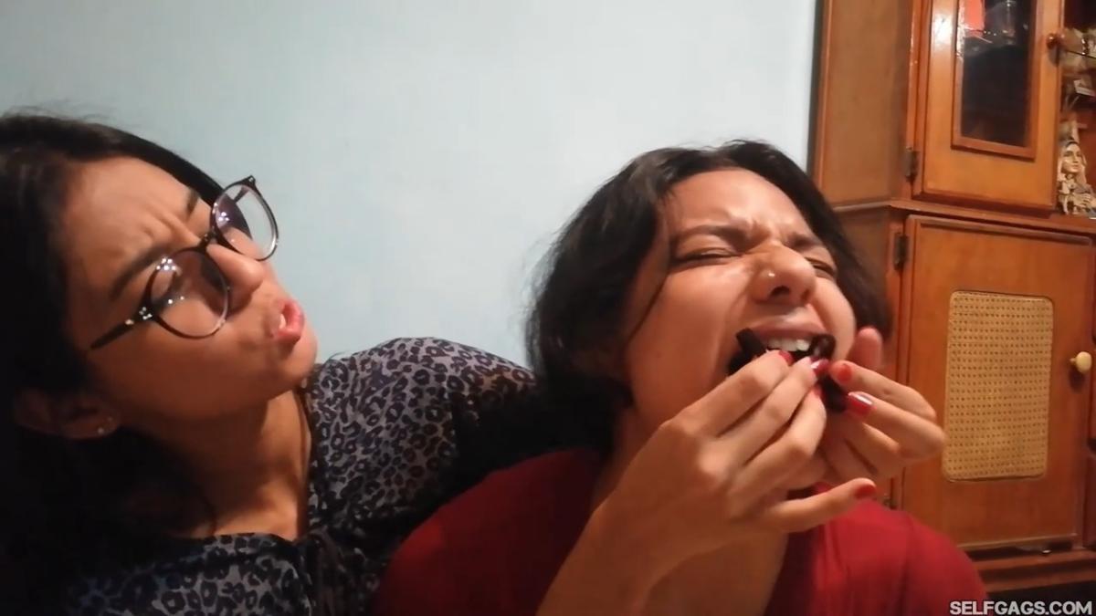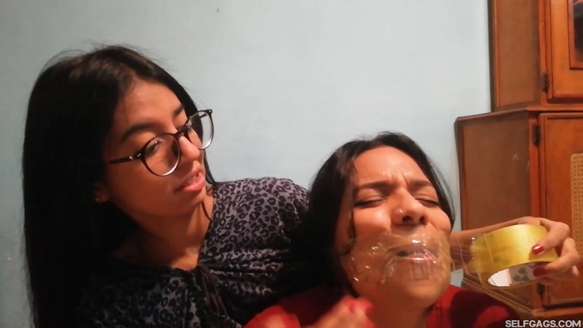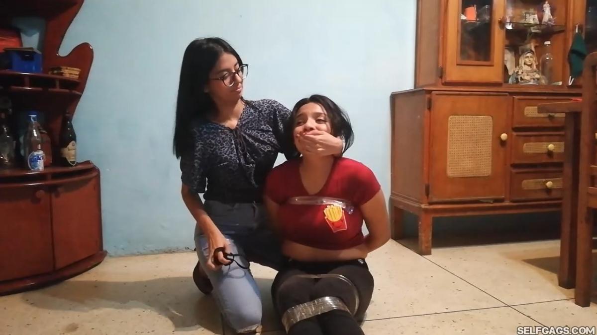 Alexandra makes bound Camila sit up and shuts her up by putting a hand over her mouth. Tall Alexandra gives her tape bound friend a lecture on shutting up by keeping her hand gagged and teasingly showing her a dirty black thong. Was it worn by Camila? By Alexandra?