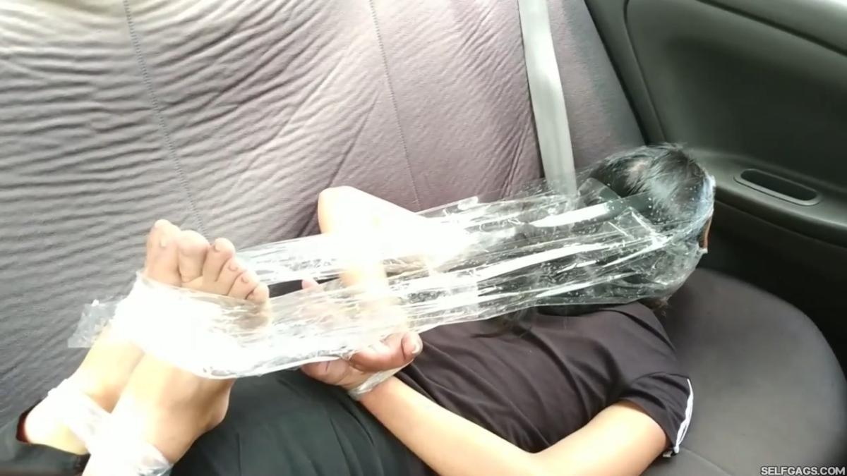 In the car, the jogger is put in the backseat where the dominant MILF binds her with clear duct tape. The crazy woman then removes the jogger’s smelly shoes and both of her sweaty running socks. She shoves the socks in the girl’s mouth and brutally wraps it shut with clear tape! The girl’s gag is done so tight that she can’t move her trapped lips at ALL underneath the multiple layers of clear tape winded around her head!
