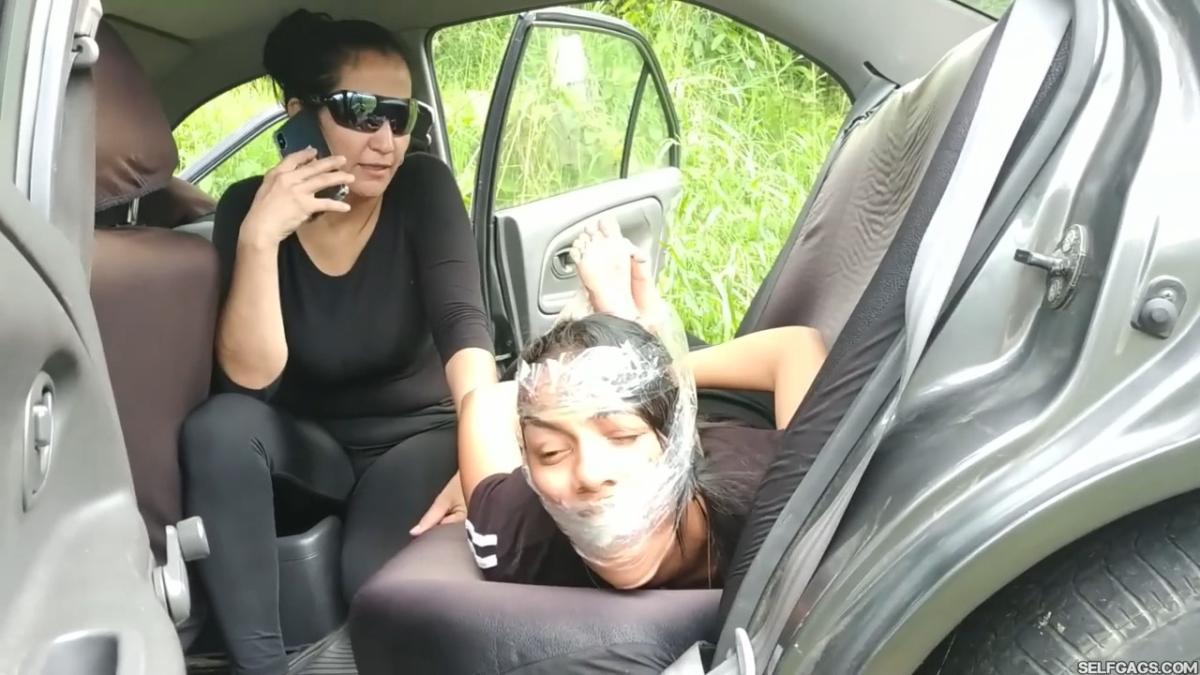 The evil MILF puts the young girl on her stomach in the backseat and hogties her. The woman runs the roll of tape around the girl’s ankles and up across her stinky sock stuffed mouth as well as her forehead to keep the poor thing looking straight up!