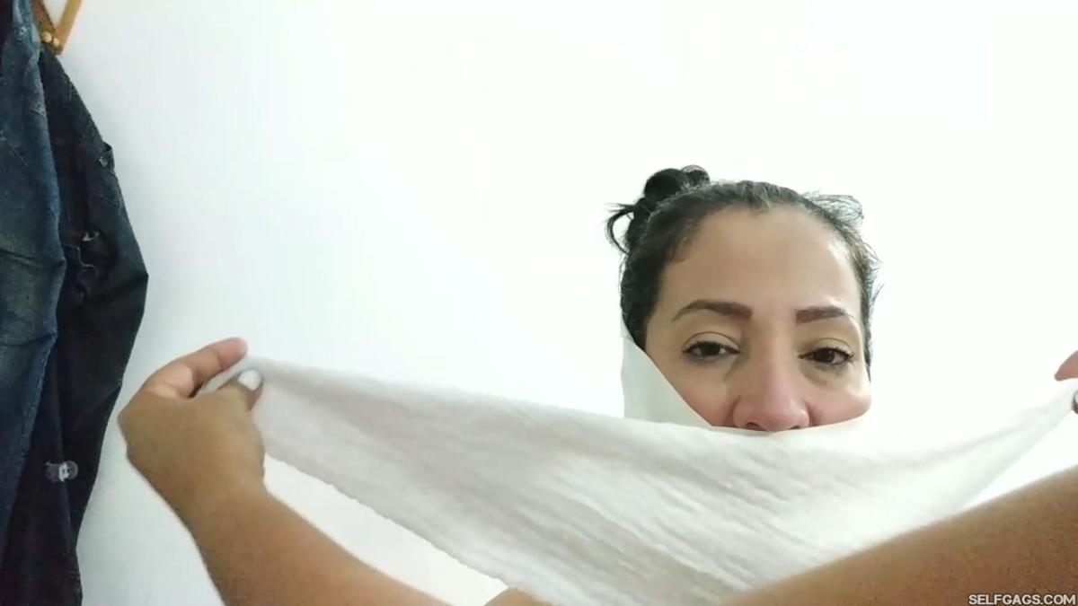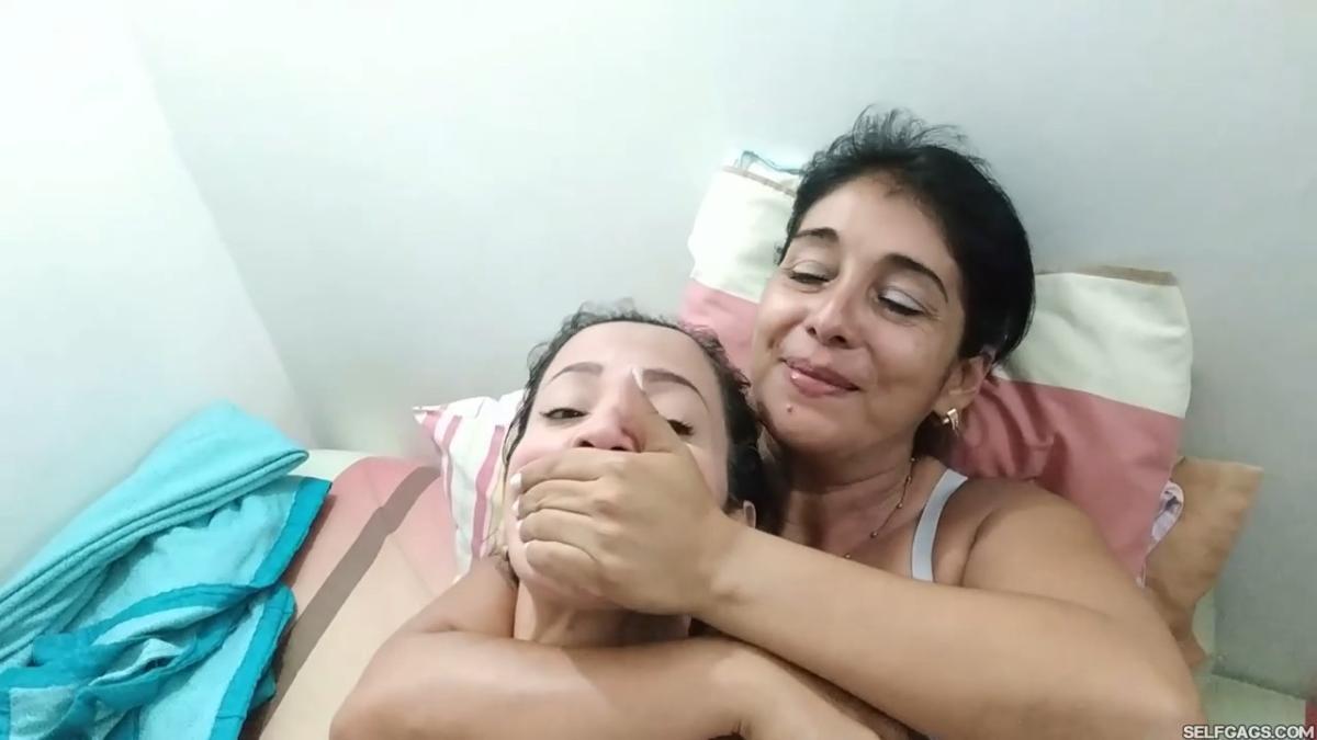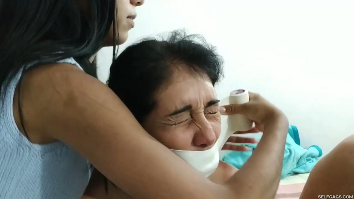 Wendy handgags Laura, smothers her, and gives her a proper gag with socks, microfoam tape, and vet wrap. Laura moans and mumbles as Wendy dominates her, spanking her many times. However, their game is interrupted by Laura’s stepdaughter, who catches them in the act and criticizes them for their kinky actions.