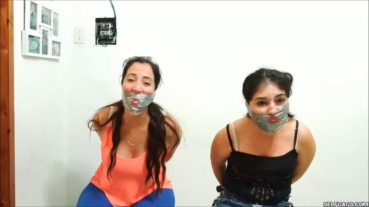 A mother and her oldest daughter are tied on chairs with bags over their heads. A girl comes in to remove the bag from the daughter’s head, revealing that she is gagged with duct tape. Her gag is removed and replaced with a handgag follows by a sock gag, and a tight duct tape wrap gag before her head is bagged again!