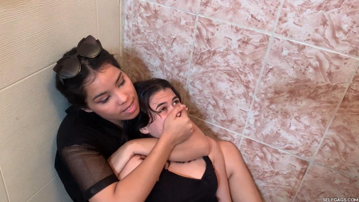 The girl tries to scream into the silencing palm covering her mouth but the cat burglar is too strong. The hand gagged girl’s sister really needs to go pee too so she knocks the door. The cat burglar turns her hand gagging into a ruthless handsmother so the girl won’t be able to scream!