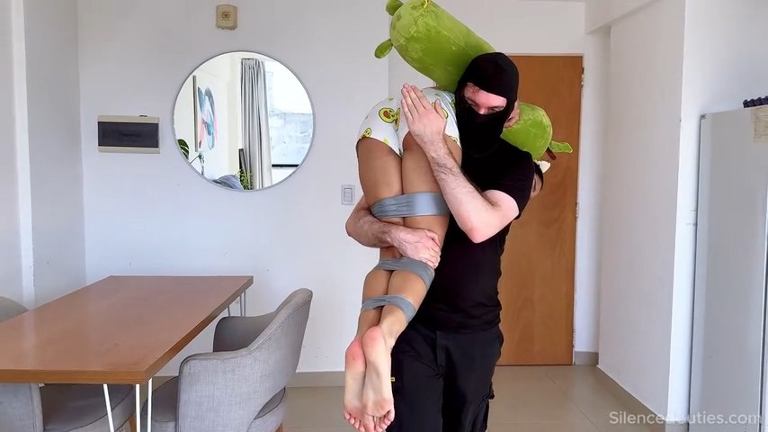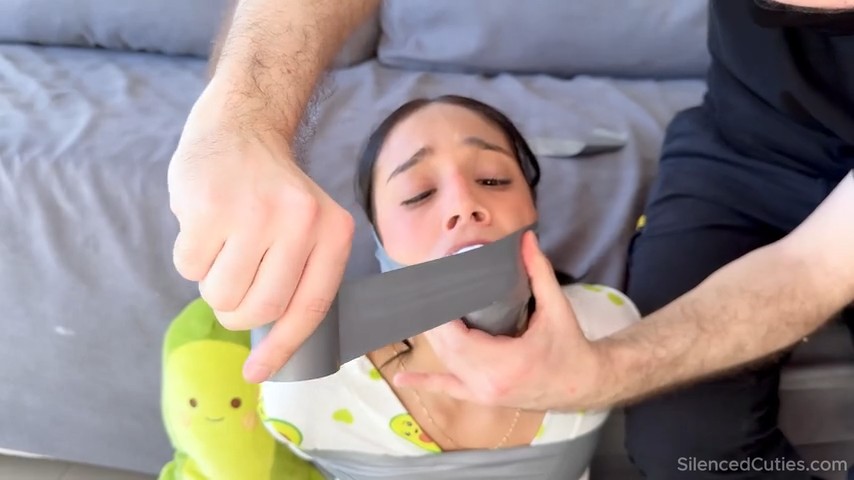 Katha Dawson orders pizza but instead gets bound, gagged, and stuffed with three socks! Tightly wrapped in tape and sealed from nose to chin, her mouth is packed to the max. The “delivery guy” tops it off with cat ears and a drawn-on kitty mouth, turning her into the cutest, most silenced customer ever. Triple-stuffed, tape-gagged, and helpless, Katha squirms adorably in this playful bondage fantasy! From Clips4sale studio Silenced Cuties.