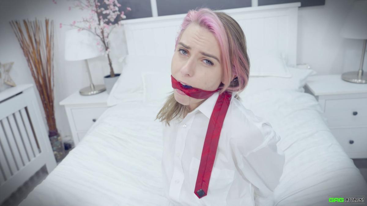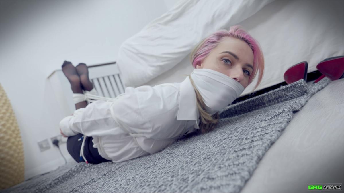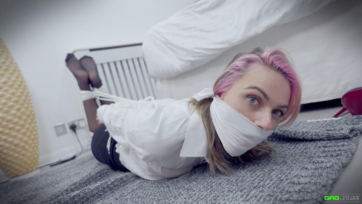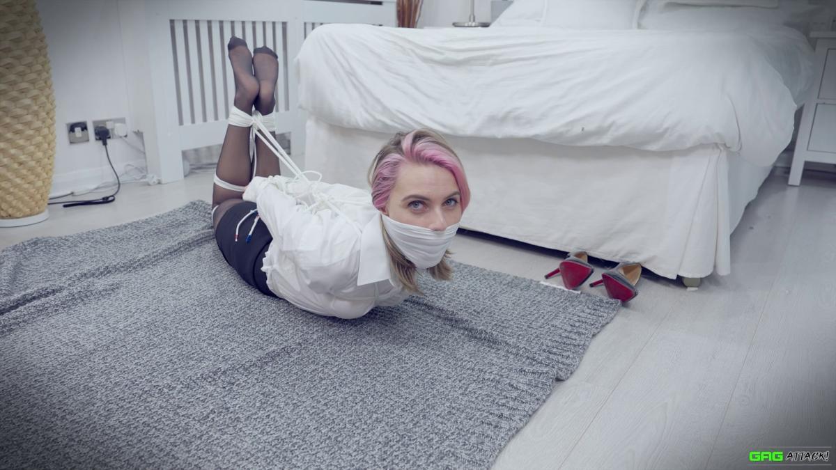Popstar Chloe is ambushed in her hotel room and forced to gag herself with her panties and tie. Tightly bound with rope, she moans through layers of gags—from cleave to ballgag to sock-stuffed OTM—each silencing her more. Helpless in a tight hogtie, Chloe squirms, MMMMPPPPHHHing in frustration and secret pleasure as escape slips further away. From Gag Attack Bondage at Clips4sale.