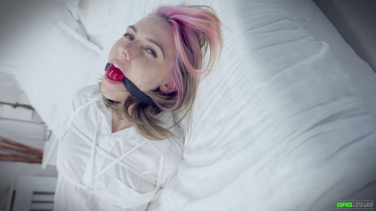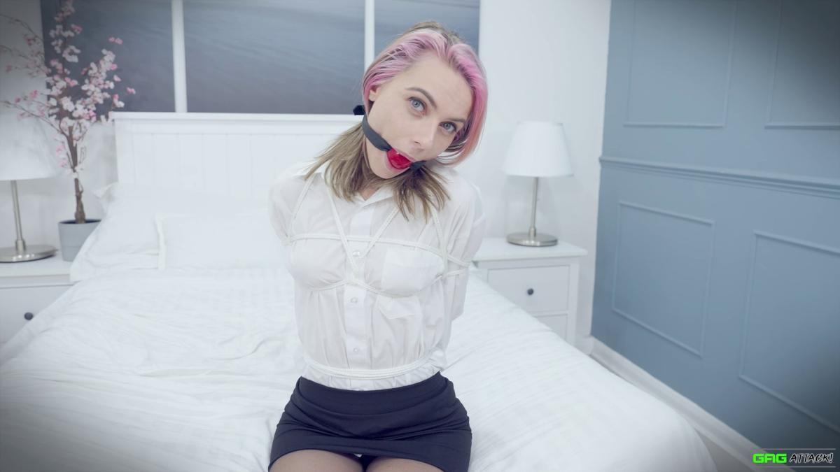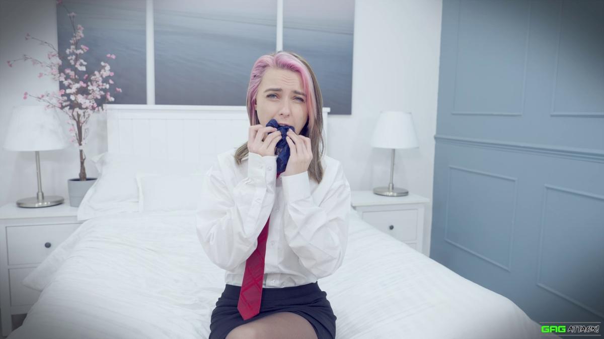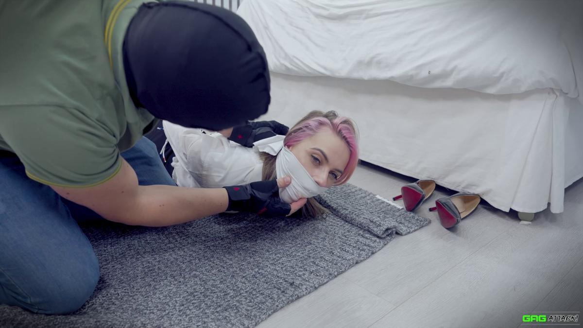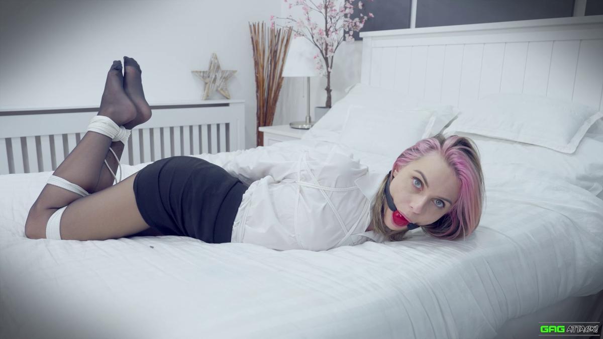 Popstar Chloe is ambushed in her hotel room and forced to gag herself with her panties and tie. Tightly bound with rope, she moans through layers of gags—from cleave to ballgag to sock-stuffed OTM—each silencing her more. Helpless in a tight hogtie, Chloe squirms, MMMMPPPPHHHing in frustration and secret pleasure as escape slips further away. From Gag Attack Bondage at Clips4sale.