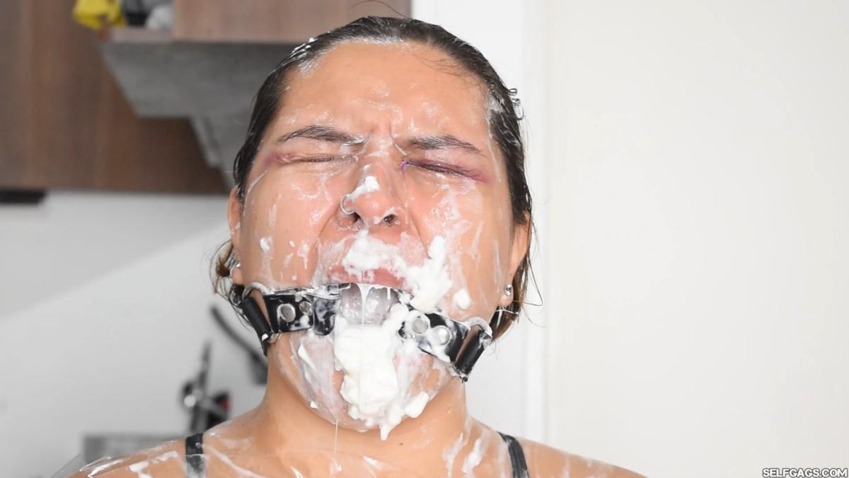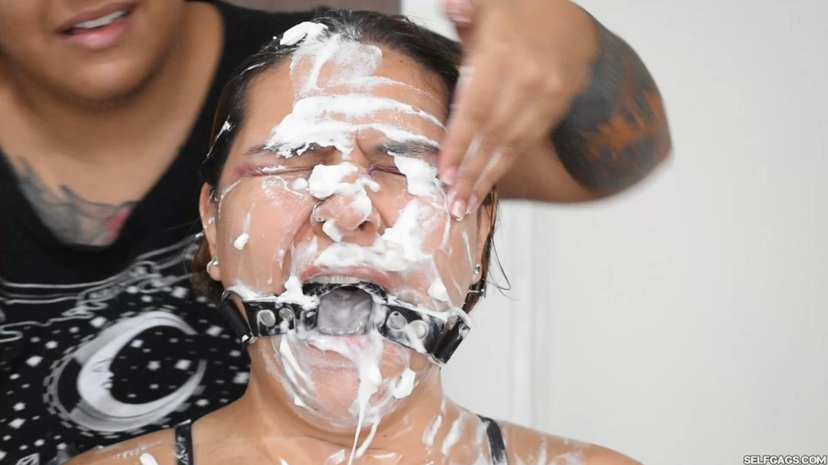 Then starts a super wet and messy whipped cream domination where Paulina sprays whipped cream inside Penelope’s ring gagged mouth and all over her face, giving Penelope a really tough time as Paulina’s slave girl!