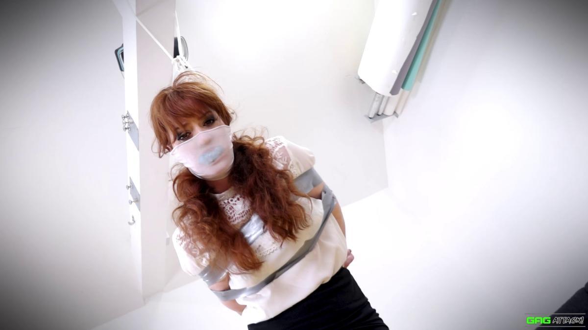 Secretary Zoe is grabbed at work and tape-tied with a tight duct tape gag wrapped around her head. Gag swaps follow—microfoam, panties with Tegaderm tape gag, and a clear OTN gag—leaving her fully silenced and helpless. Strapped in strappado, she writhes and mmmppphhs in desperation, unable to escape or call for help. From Gag Attack Bondage at Clips4sale.