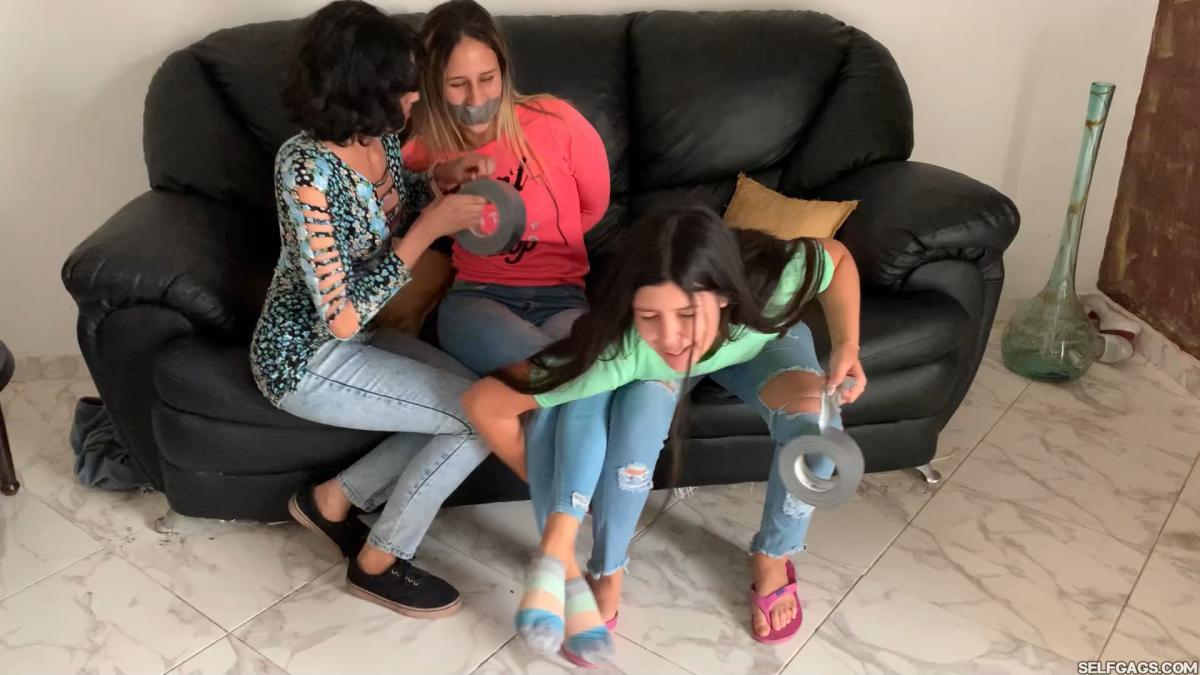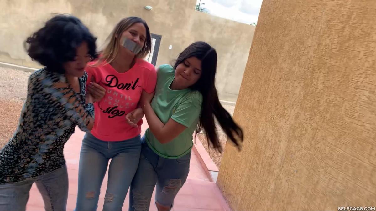 Sexy tall college girl Khloe is hands-tied and duct tape gagged. She is escorted into a house by her two female kidnappers.