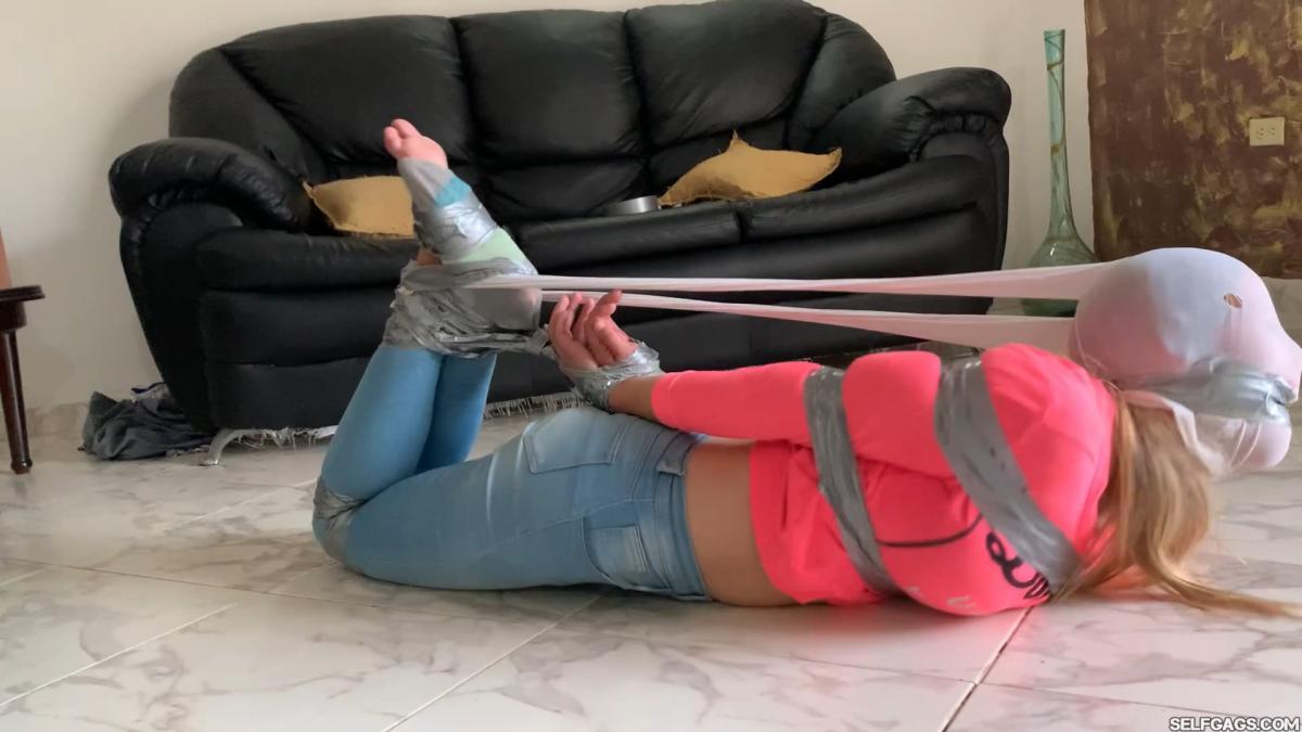 The gagged girl is then hogtied helpless and left to struggle in her sexy pantyhose bondage.