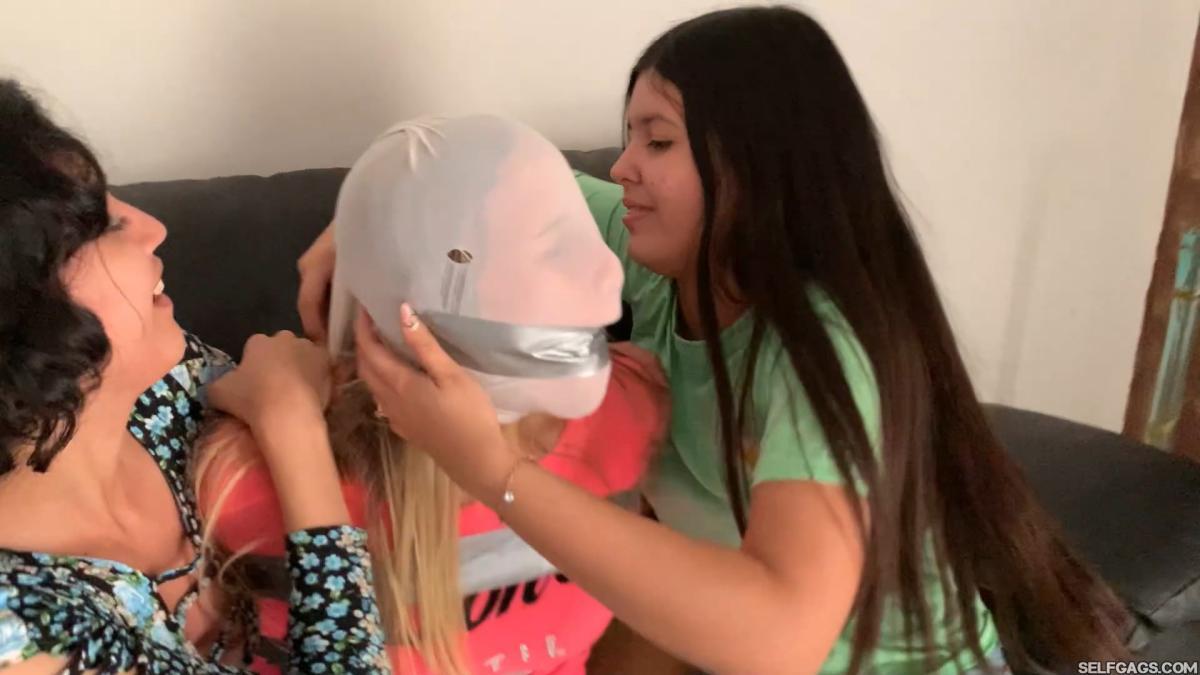 The dominant women are going to turn Khloe into their hogtied pantyhose encased piggy girl. They are gagging her with dirty socks and giving her a head encasement with pantyhose. The hood is followed by a tight tape gag to humiliate the girl.