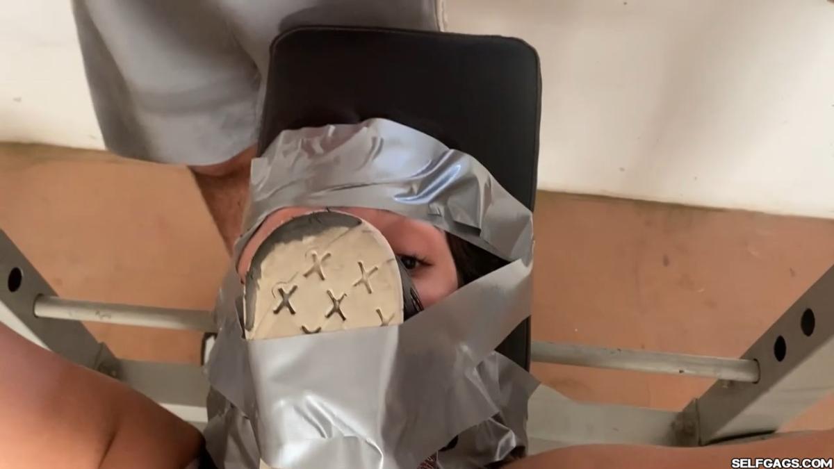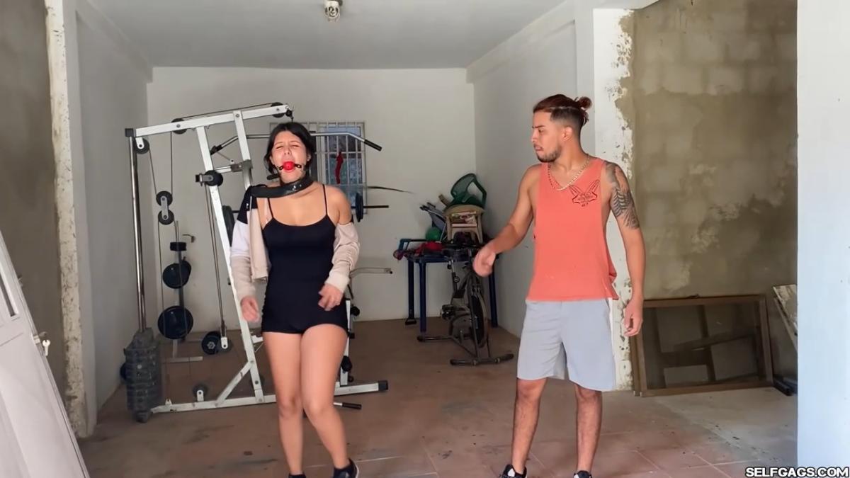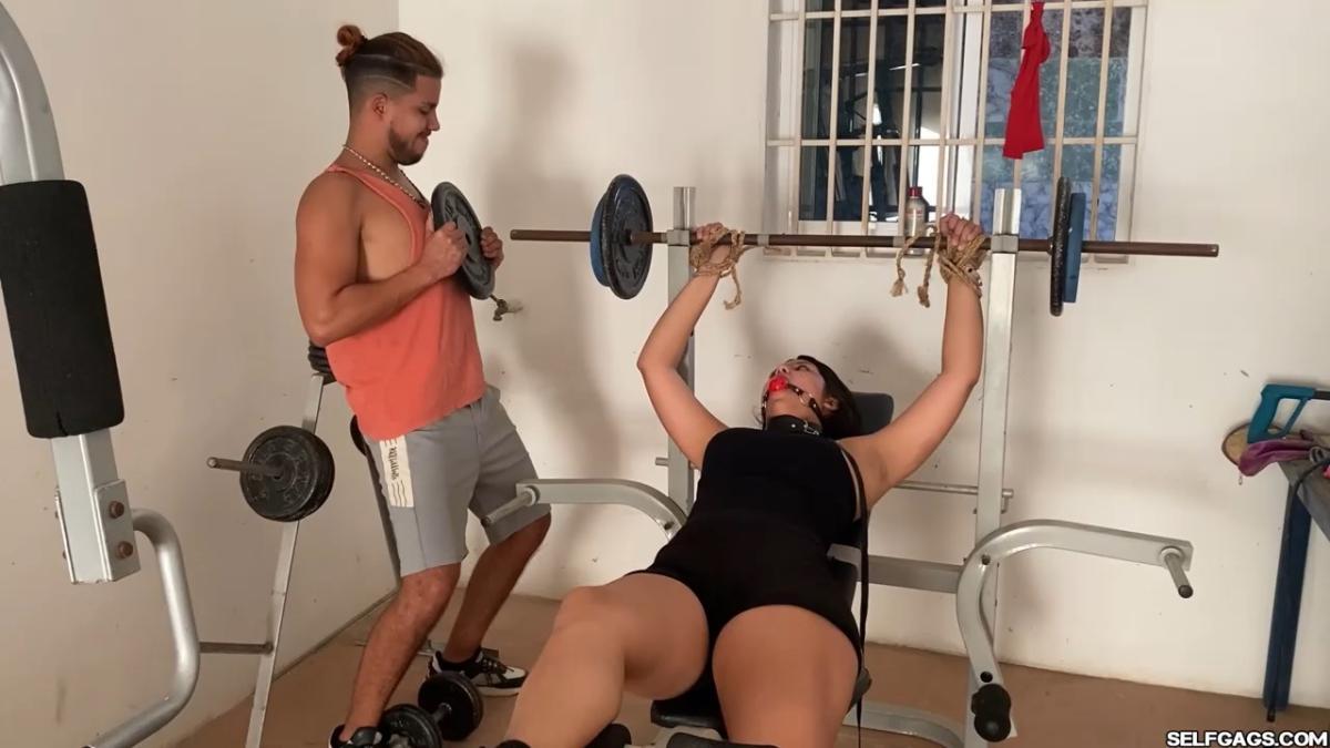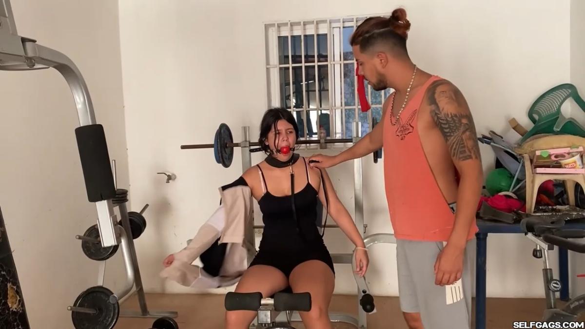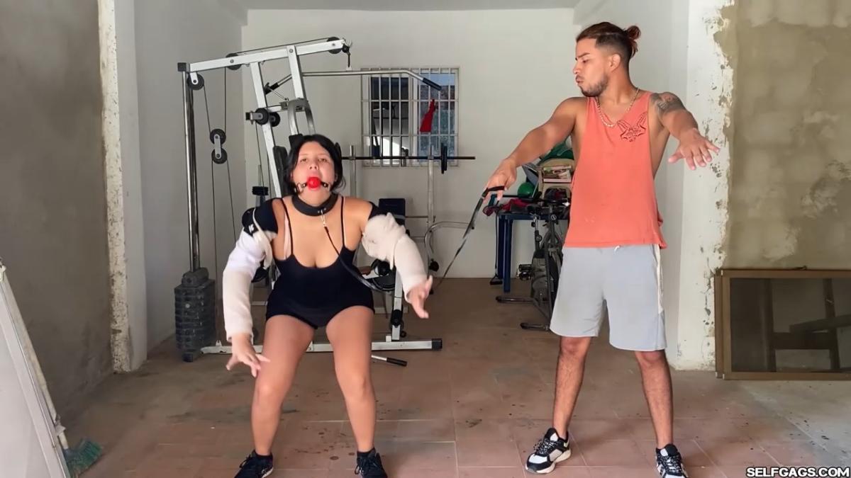 His personal trainer, Mary Macaya, is a real bitch and he has had enough of her dominant attitude! He enslaves her with a ball gag and a leather collar with a leash attached to it and makes her do all kinds of gym exercises under close supervision. From SELFGAGS Clips4sale studio.