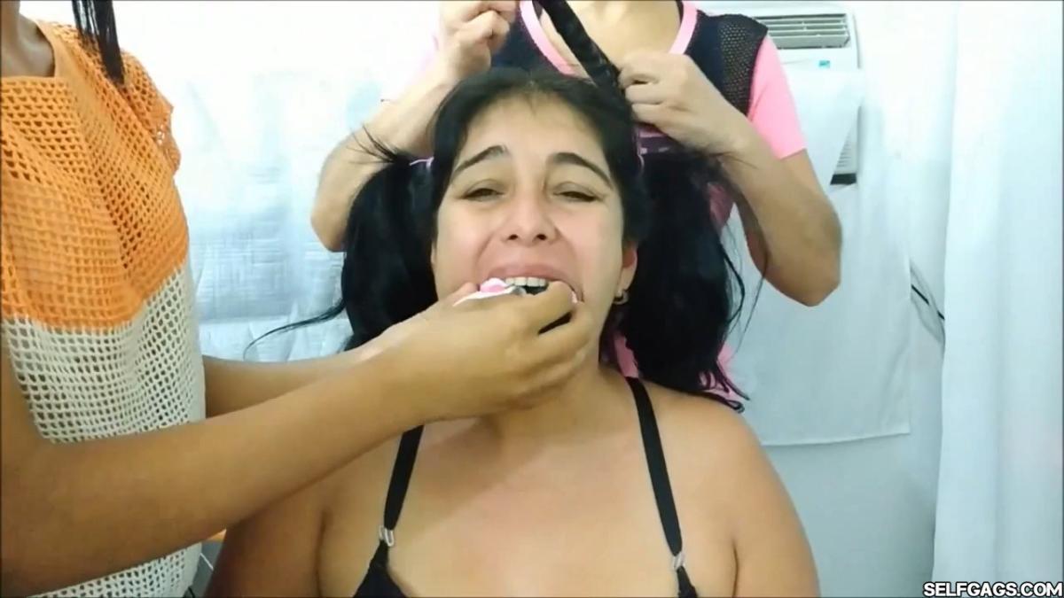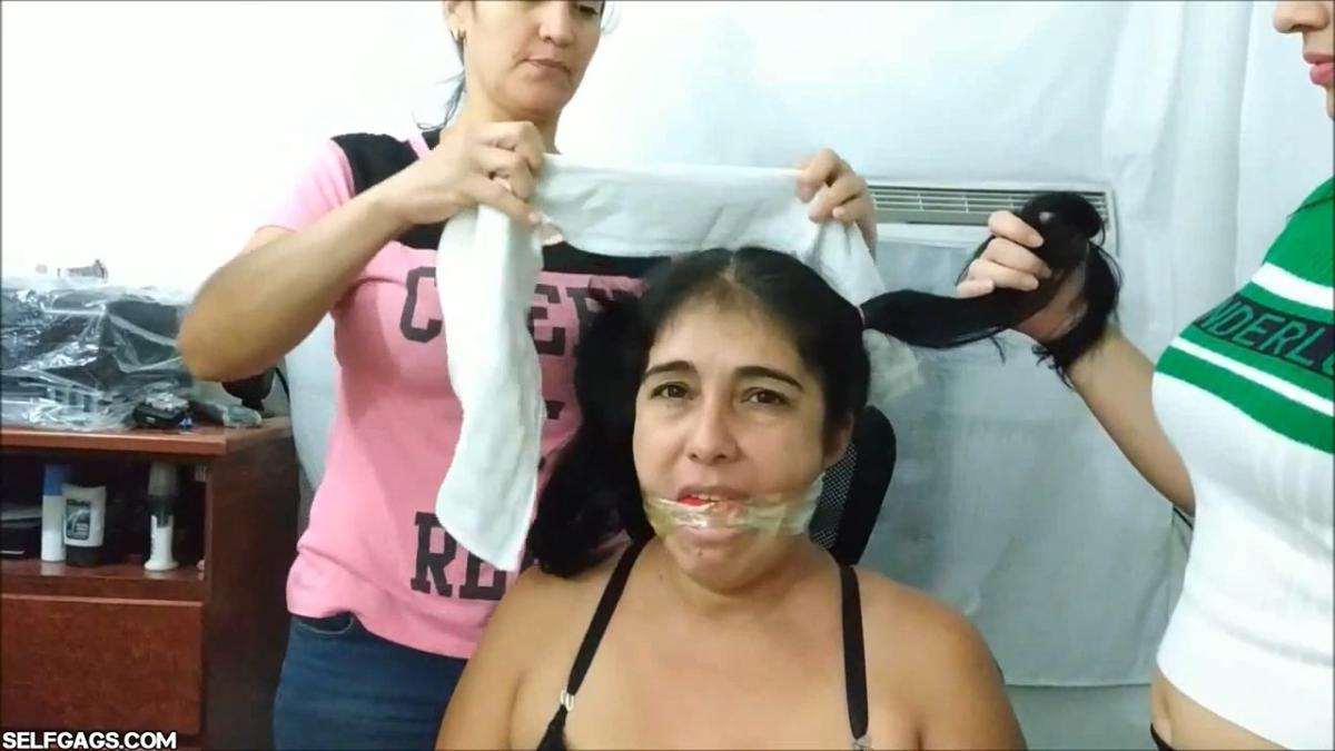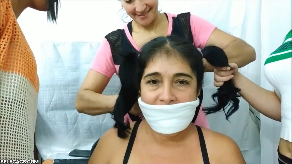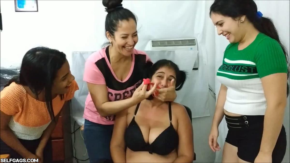 A bound Latina MILF is the victim of 3 women gagging her mouth with panties, socks, tape, and pantyhose encasement! The mature gag slut has her stuffed mouth silenced and packed by the playful girls!