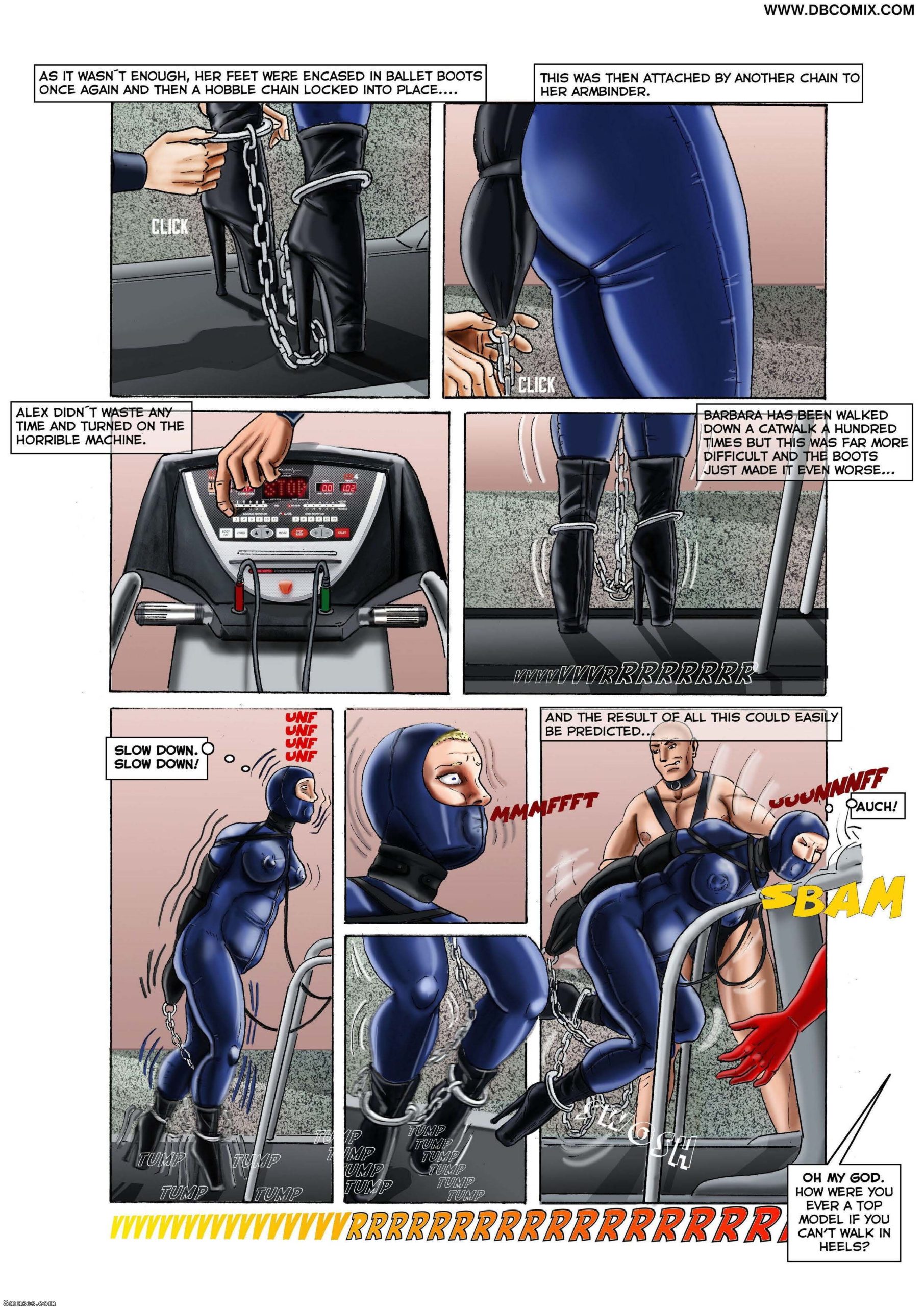 Lora subjects Barbara to brutal forced workouts in skin-tight latex catsuits, en pointe ballet boots, hobble chains, panty gags, anal plugs, electro-torture spanking machines, and endless treadmill torment with automatic dildo punishment.