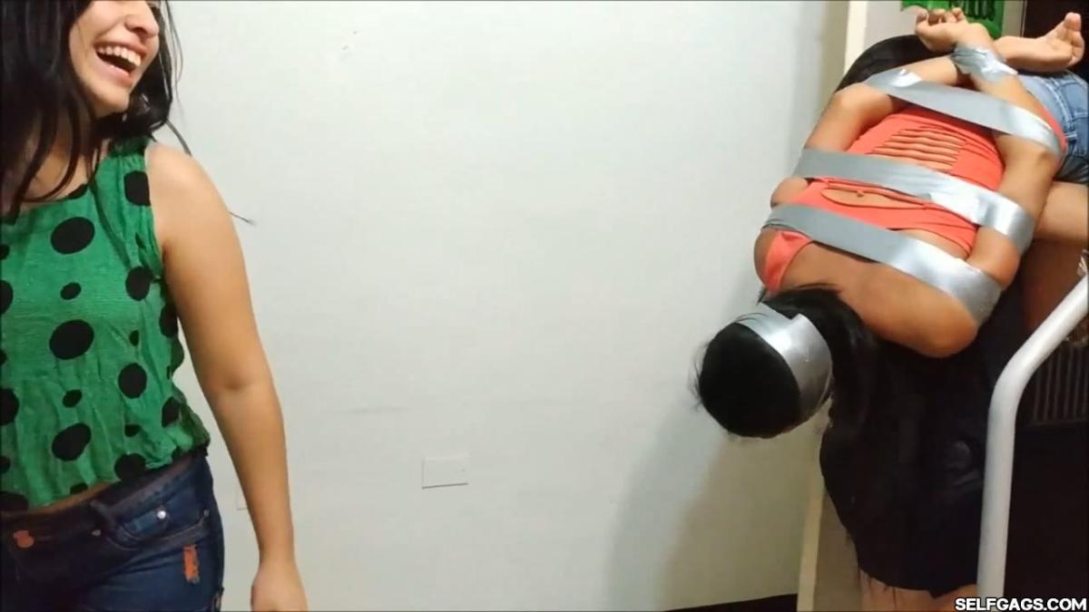 18-year-old Maria is always busy taking new pics for her social media accounts and her mom and big sister are sick of it. They overpower the selfie girl with a handgag to shut her up and duct tape to tie her up.