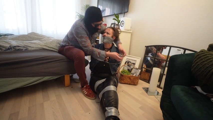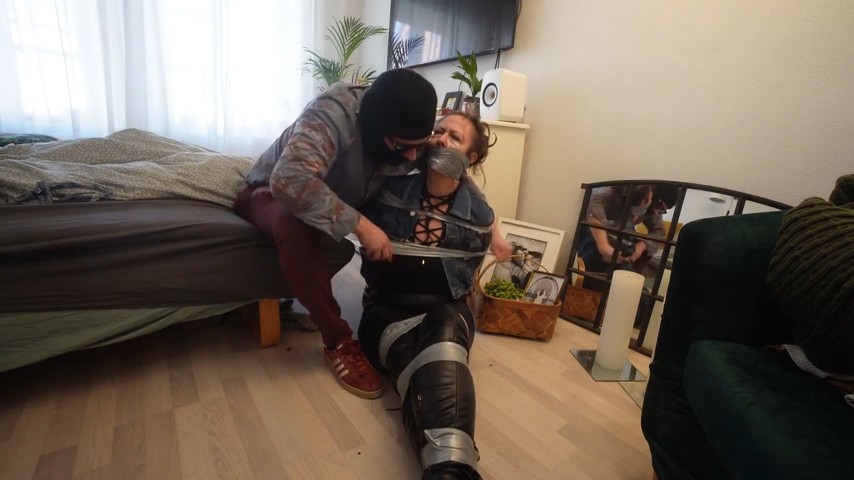 Taylor gets busted snooping on an old property—masked guy hauls her to the boss, who’s fed up with her nonstop chatter. Upstairs, he tapes her tight in stiletto boots and leather leggings, stuffs a big rag in her mouth, and seals it with a thick wrap gag. She mmmphs cockily as he leaves, but frees her hands and bolts—only to get caught and re-taped harder, arms pinned, body wrapped. Squirming on the floor like a feisty slut, she gagtalks in vain before the pickup in 10 minutes. Edgy tape bondage fun from Clips4sale Blueeyedbondage studio.