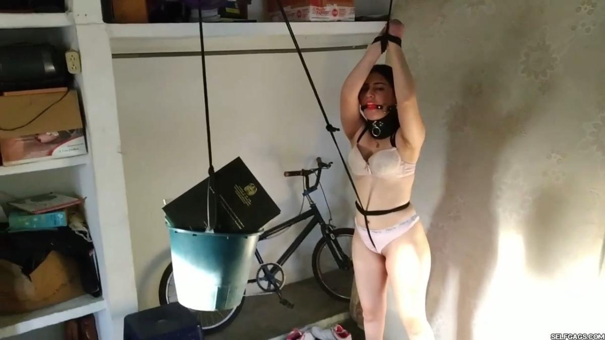Katherine Martinez visits doctor Laura for pussy power! Stripped to undies, wrists roped overhead, collared and ballgagged, drool flowing. Crotchrope grinds her cameltoe, linked to a bucket loaded with books—weights yank her slit tighter, making her moan like a desperate whore as her cunt clenches hard. Teasing pressure builds to dripping arousal for this bound slut. Erotic fetish from Clips4sale Selfgags studio.