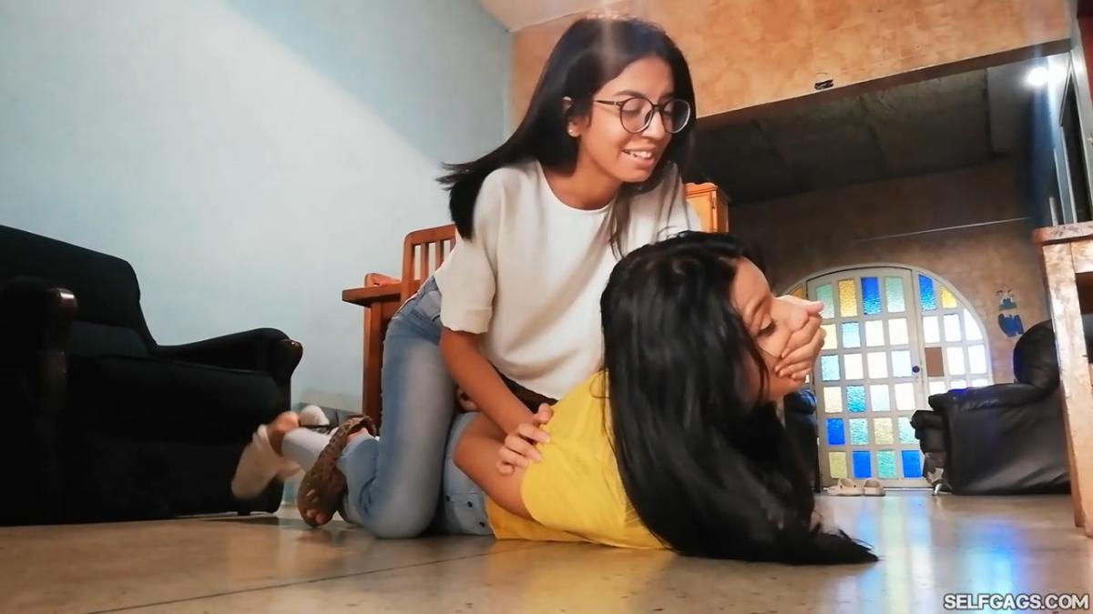 Alexandra confronts Camila but Camila totally denies having texted Alexandra’s boyfriend and even more so when she is shown the flirting messages as proof. Alexandra grabs her best friend and wrestles her down on the floor where she ties Camila’s hands behind her back as well as her ankles with cable wires!