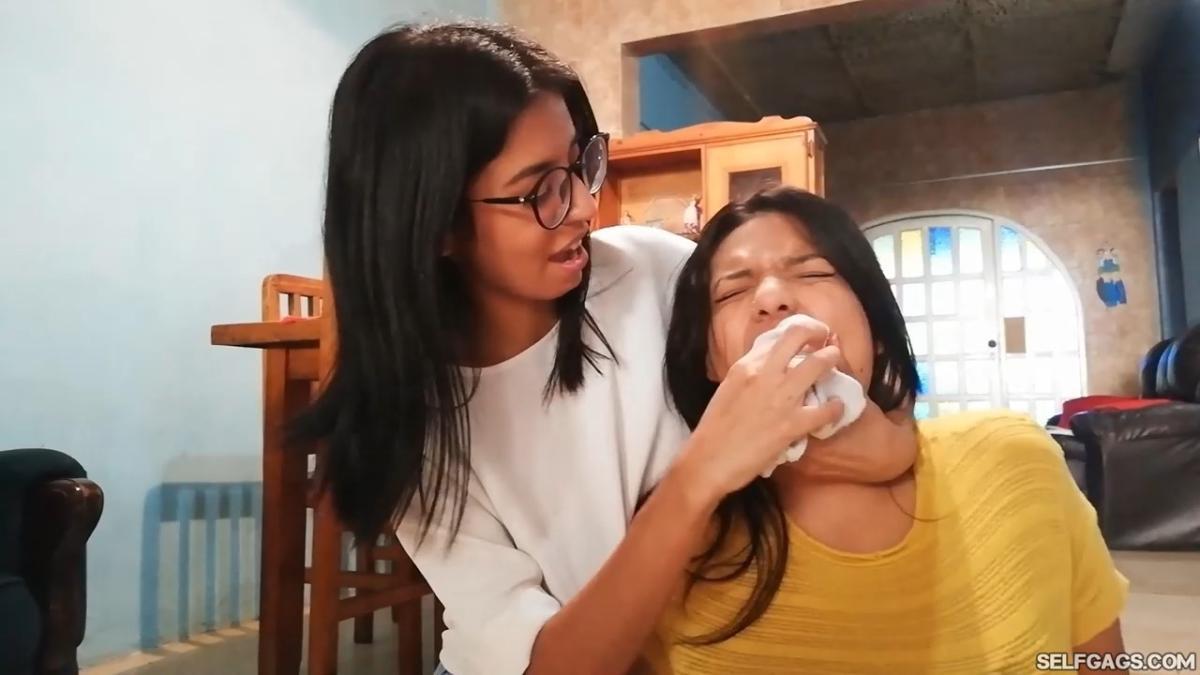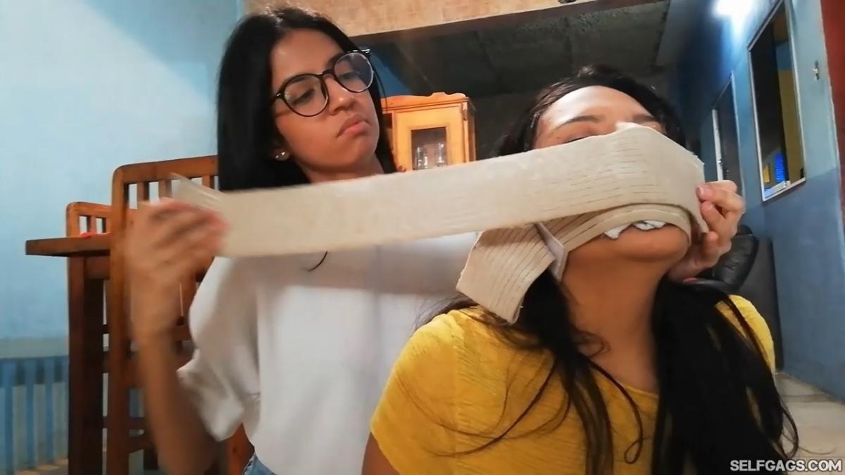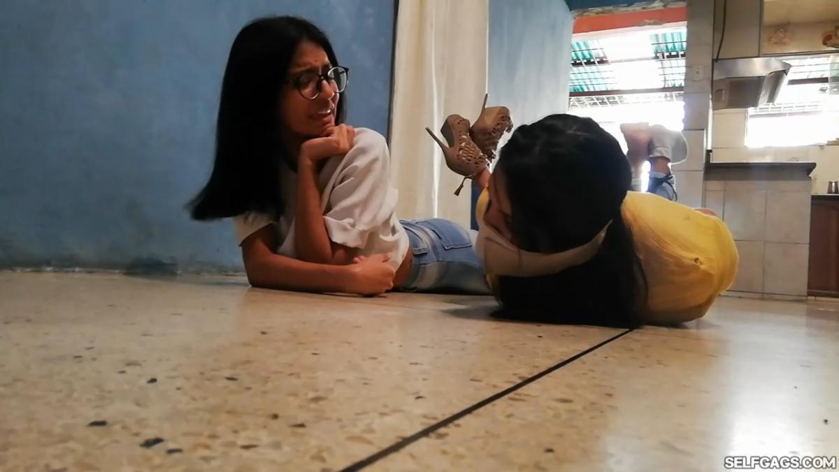 Alexandra drags one sock off of Camila’s feet and has her wired friend sit up for the gagging. Alexandra puts a hand over Camila’s mouth and explicitly shows Camila her own worn sock as she explains what is going to happen next. Alexandra shoves the sock in Camila’s mouth and quickly wraps a layer of support wrap around her head!