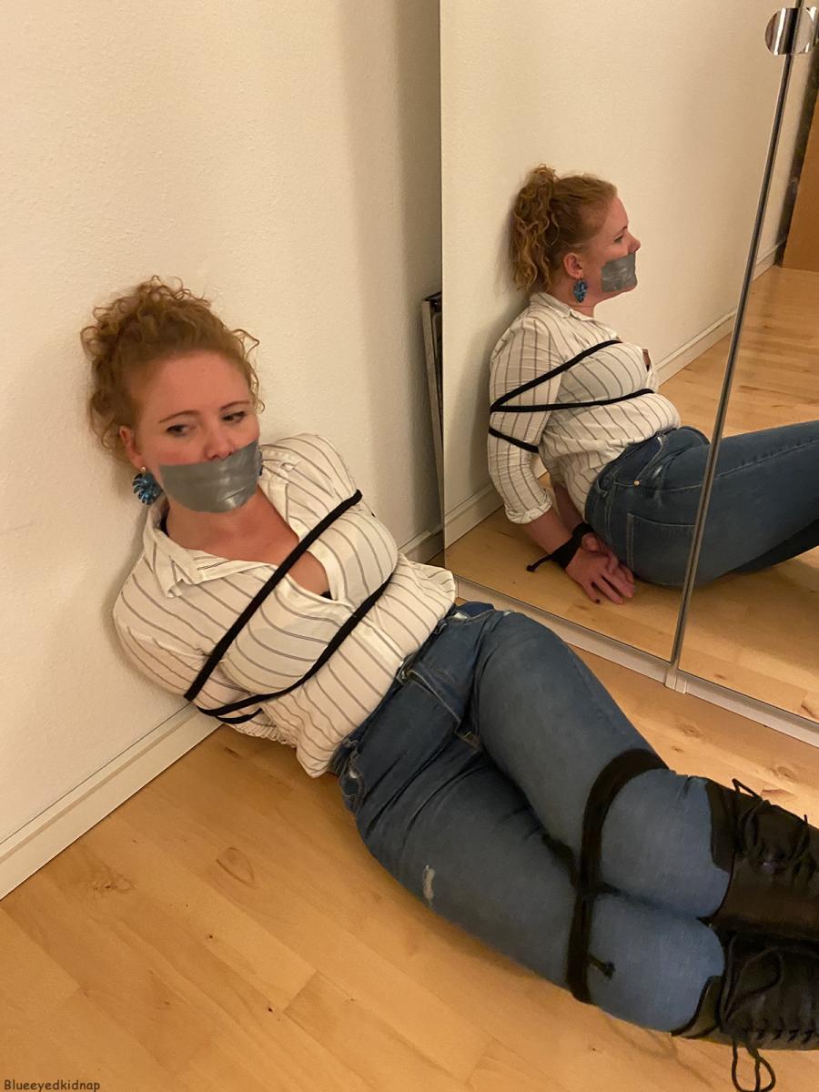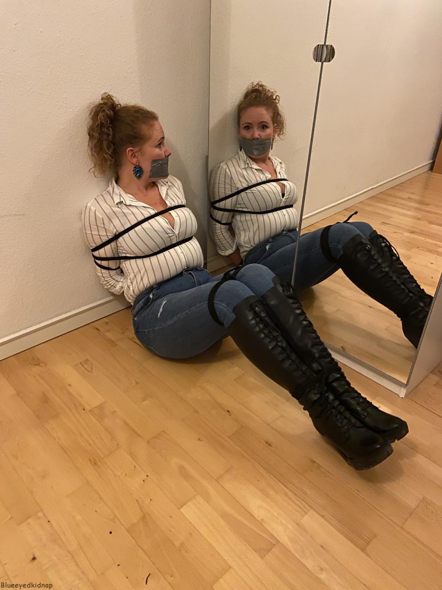 Danish bondage girl May is all tied up in tight jeans, long boots, and blouse! The helpless damsel in distress is tape gagged and struggling against her ropes on the floor, hoping to escape her bindings! From Blueeyedbondage.