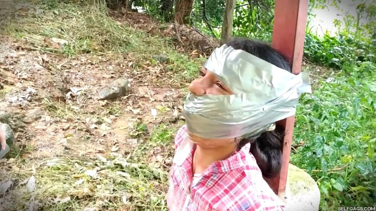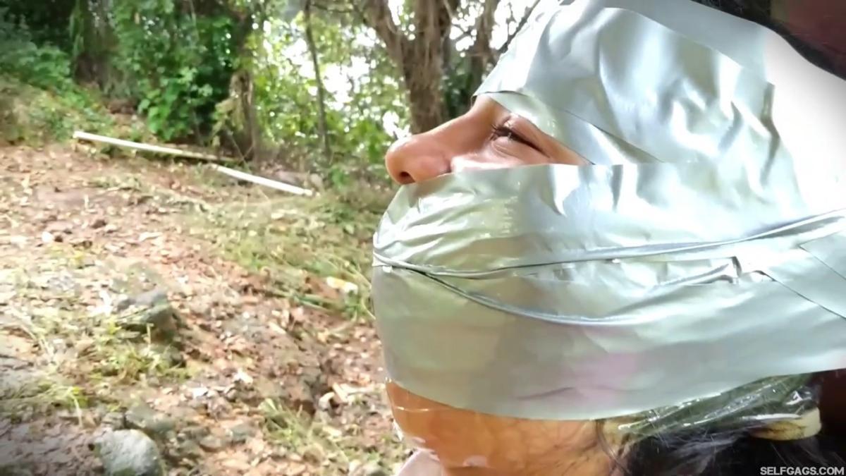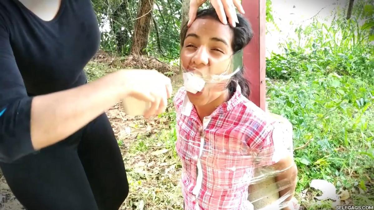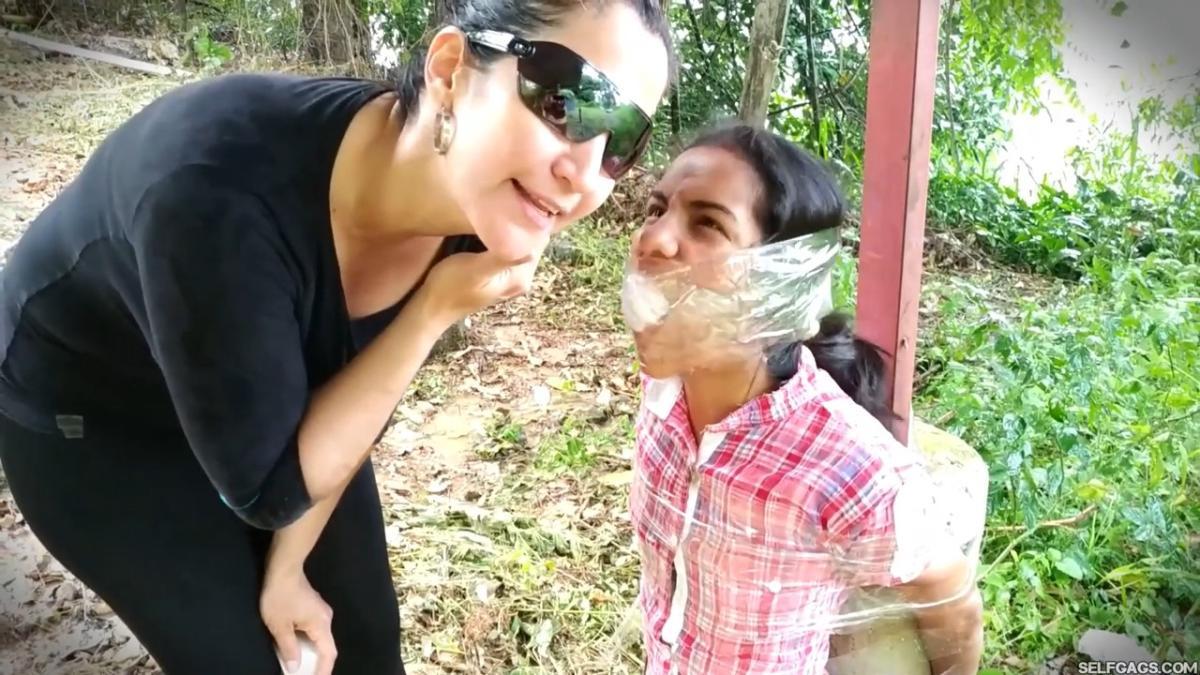 The girl yells at the criminal MILF and demands to be released, so the criminal MILF takes the detective’s headscarf bandana and turns it into a tight and silencing cleave gag for the noisy snoop! The bound and gagged girl is left on the dirty ground with beautiful mountains in the background when heavy rain suddenly starts to pour down on the feisty damsel!