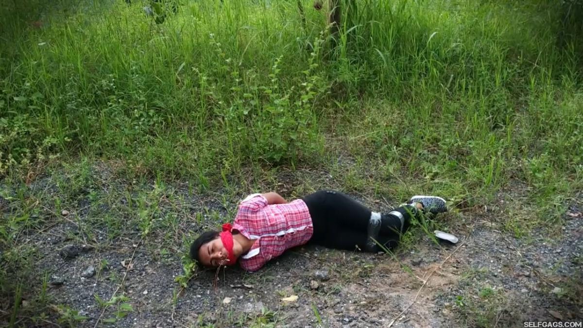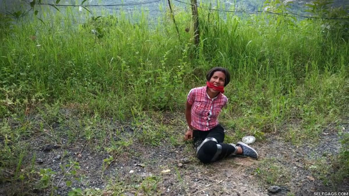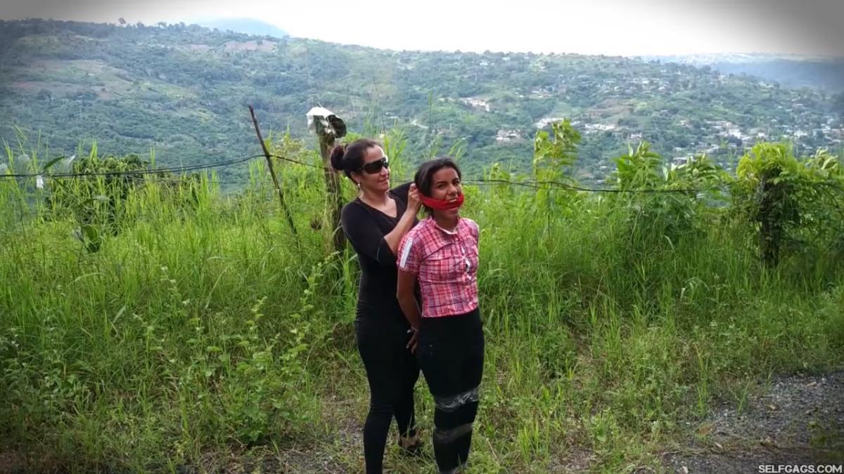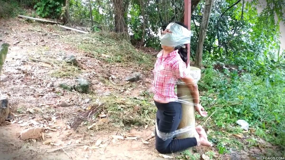 The girl yells at the criminal MILF and demands to be released, so the criminal MILF takes the detective’s headscarf bandana and turns it into a tight and silencing cleave gag for the noisy snoop! The bound and gagged girl is left on the dirty ground with beautiful mountains in the background when heavy rain suddenly starts to pour down on the feisty damsel!