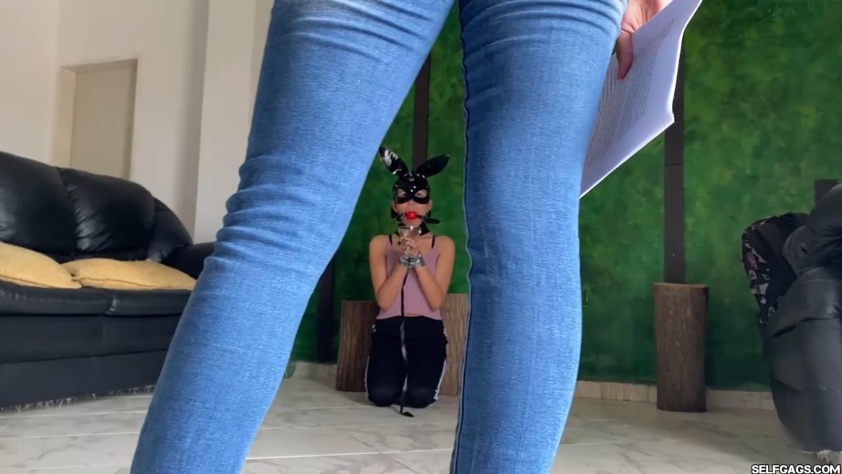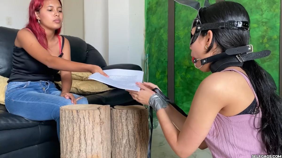 Mistress Penelopé Garcia is in the mood for a story. She makes her obedient slave (Barby Luna) write “SI” (YES) and “MAESTRA” (MISTRESS) with an eyeliner under her soles, hands her a chapter from the ‘Fifty Shades Of Grey’ book, and tells her to turn around and start reading for her. Penelopé rests her feet on each of her ball gagged slave girl’s shoulders while listening to her gag talk each and every word she’s reading out loud! From SELFGAGS Clips4sale studio.